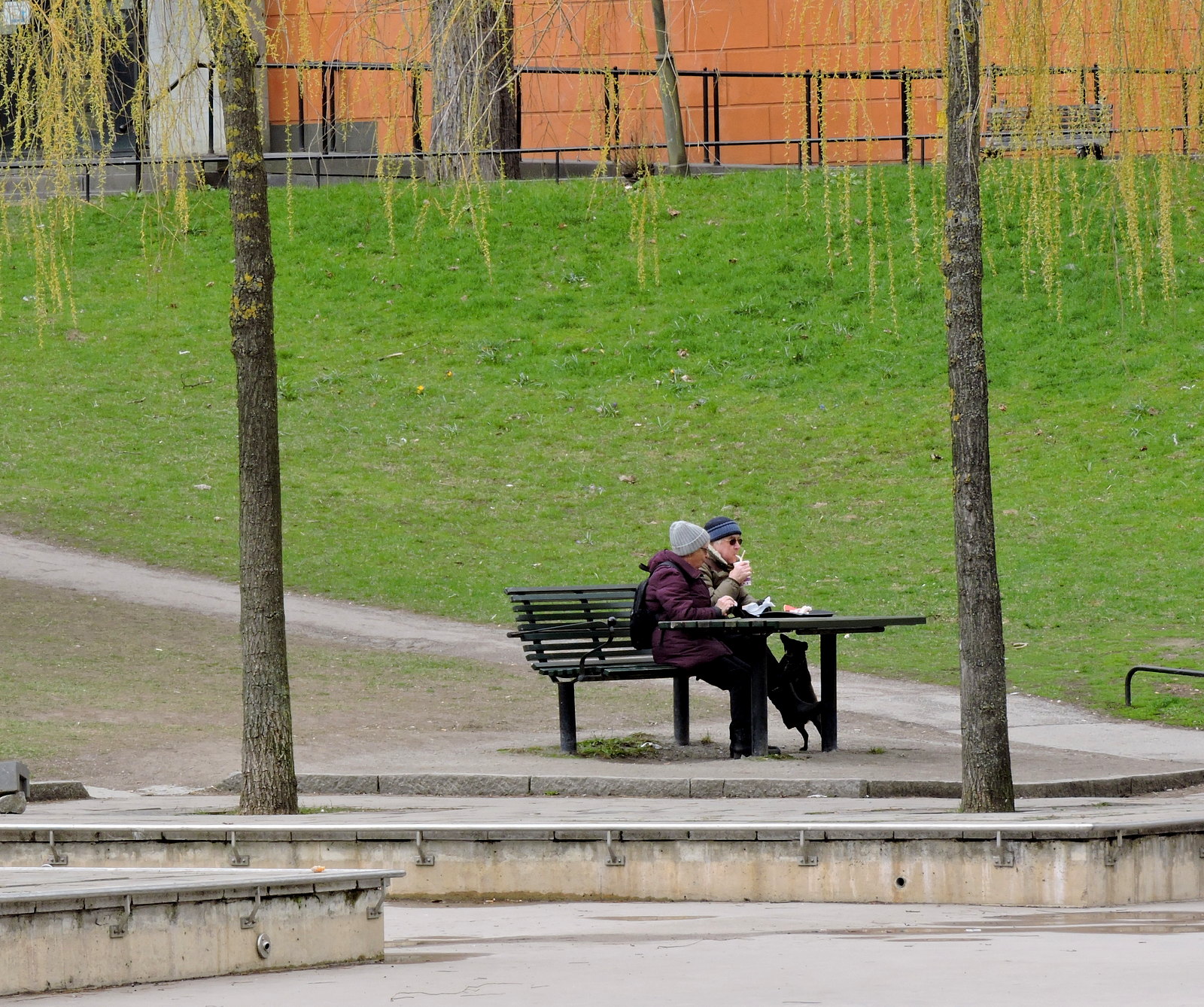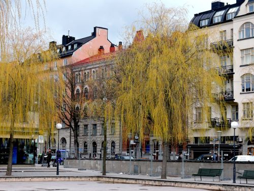 Råkade komma förbi Stadsbiblioteket på Sveavägen i dag och såg att pilarna hade börjat slå ut, ännu inte lika mycket som för två år sedan och i stället för ösregn kom det idag spridda snöflingor. Området kring dammen och kullen med kentauren håller på att omvandlas eller renoveras, så det var en inhägnad arbetsplats med mycket bråte