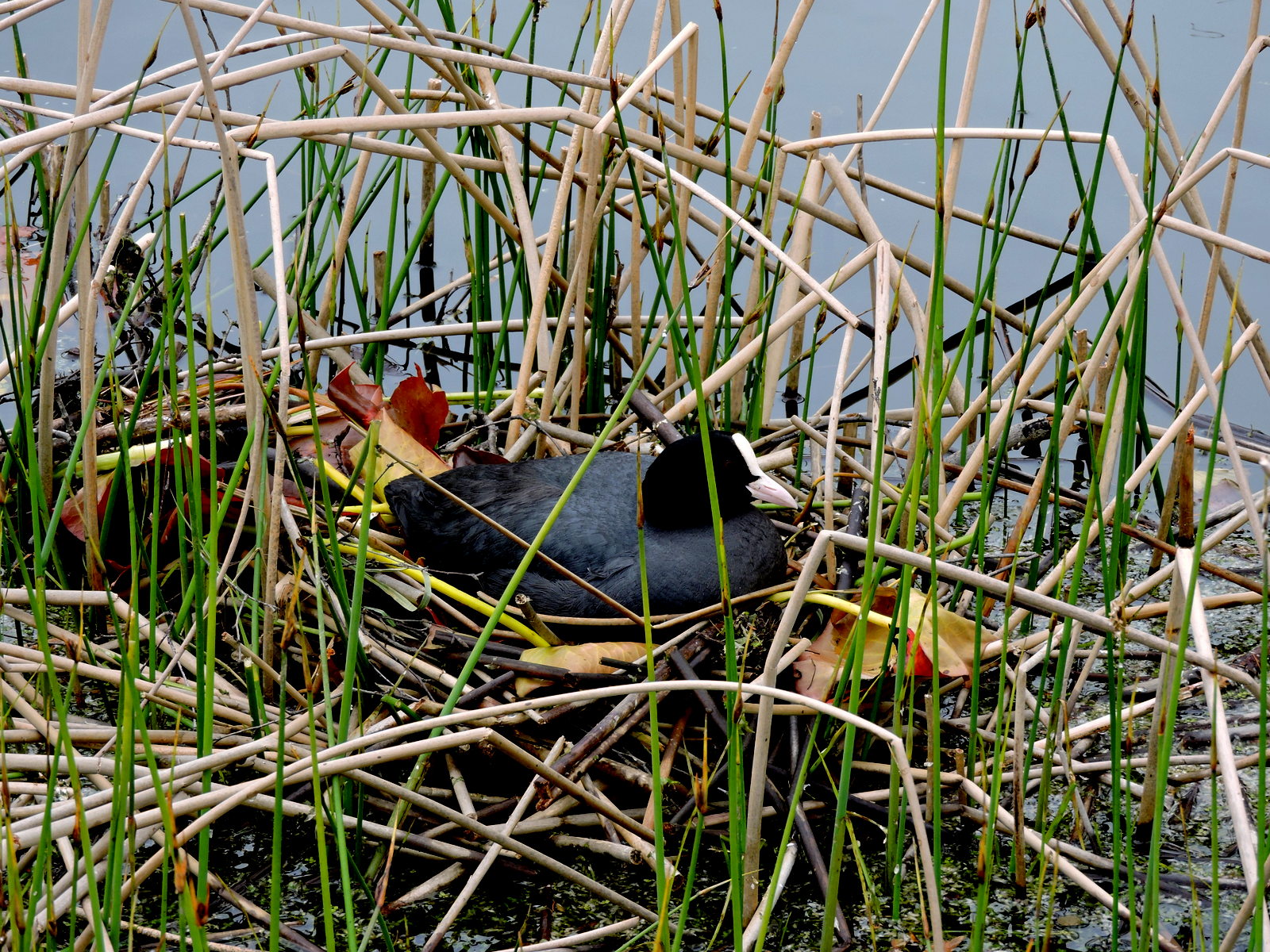 Sothönan håller koll på sitt ägg i dammen nedanför växthusen