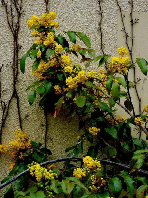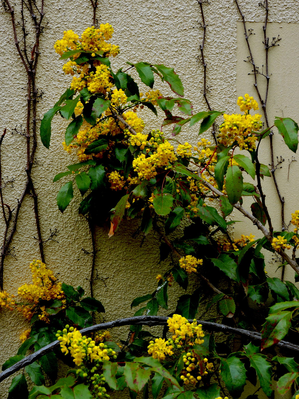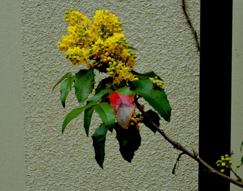 Det doftar när jag hämtar bilen och till och med inne i garaget känner jag något, javisst ja det är Mahonian, gårdens allt överflödande Mahoniahäck hade jag glömt, har önskat många gånger att en liten del av den blivit utbytt mot ett par Rhododendron, men när den blommar kan man inte störa den med sådana önskningar.