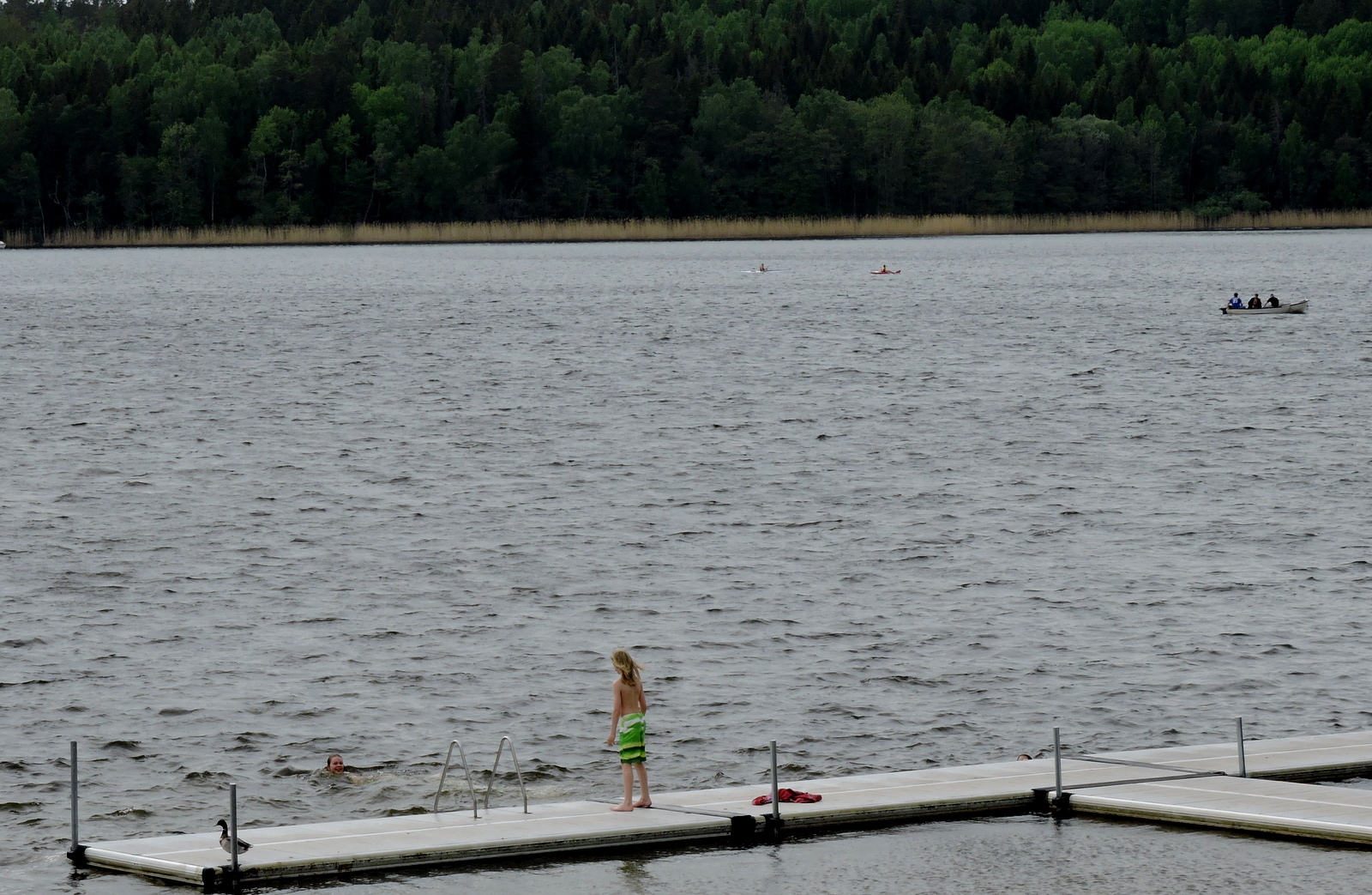 Bönderna ber att man inte ska låta barn klättra på det inplastade gräset, men ibland är de snabbare än tanken. Trots blåsten blev vi väldigt svettiga och barnen ville bada. Vi kommer ju förbi Kairo på vägen hem. Badviljan höll i sig, parkeringen var fullproppad och likaså gräsmattorna, det såg somrigt ut, men i vattnet var det glesare.