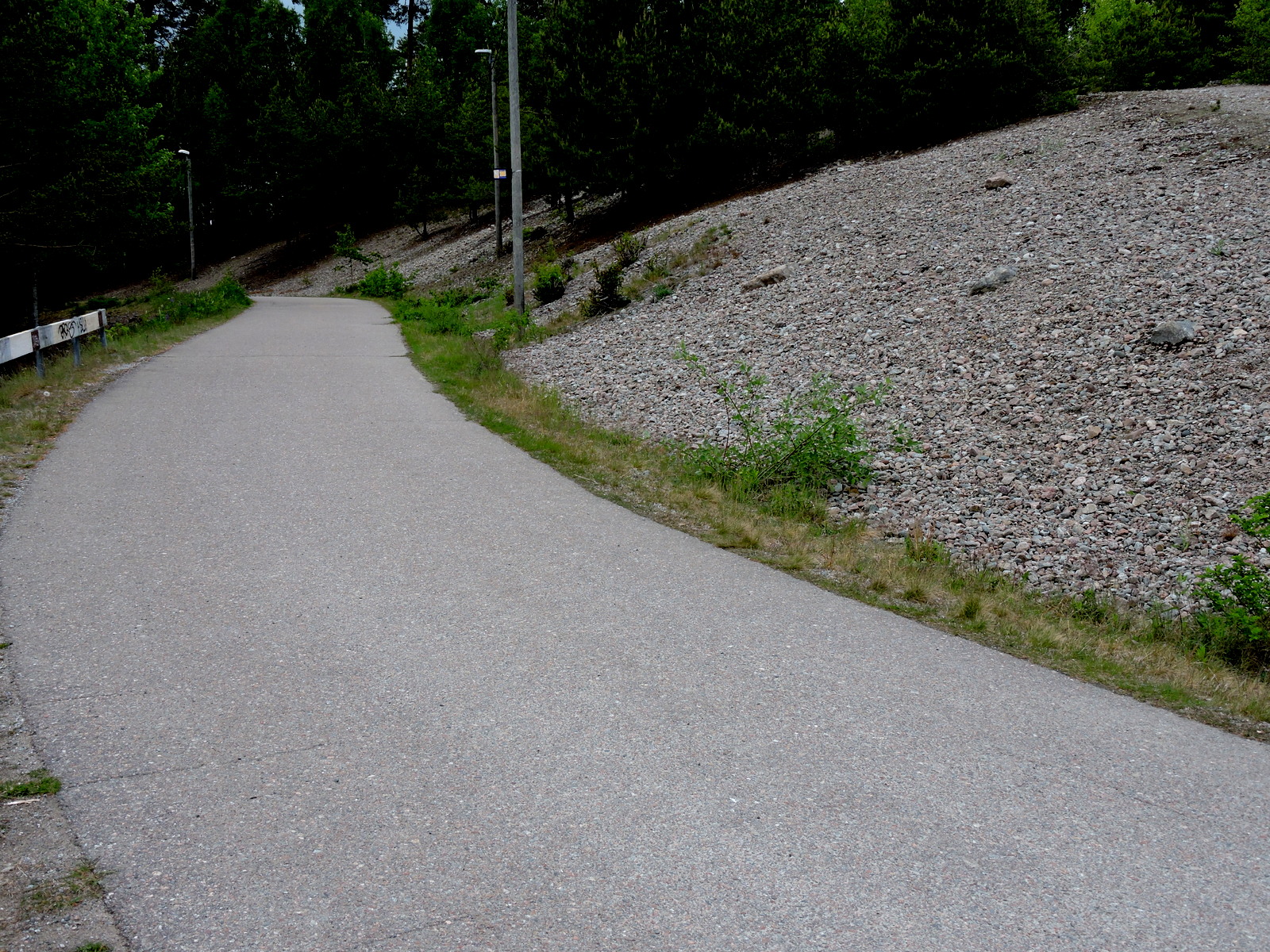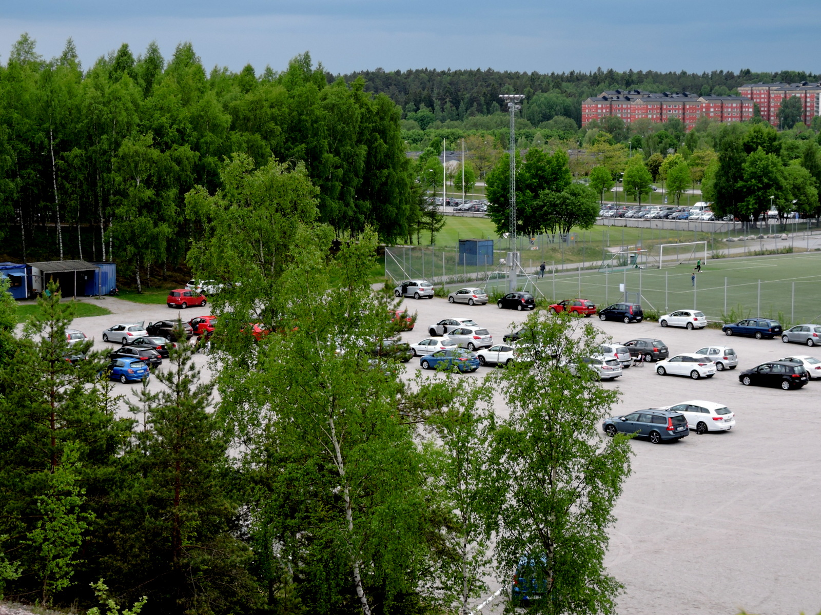 Man går upp på åsen bakom idrottsplatsen och däruppifrån ser man långt åt två håll eller hör. E4 åt ena hållet brusar intensivt och åt andra hållet pågår något vi sett på bild och hört talas om – bilbingo. Längst bakom alla bollplaner stod bilar i en klunga och en högtalare ropade ut siffrorna, det dånade och fyllde luften och hunden vägrade gå. Jag lockade med min lenaste röst och en äldre man stannade och undrade (om jag stulit hunden) men avbrottet hjälpte och vi kom vidare.