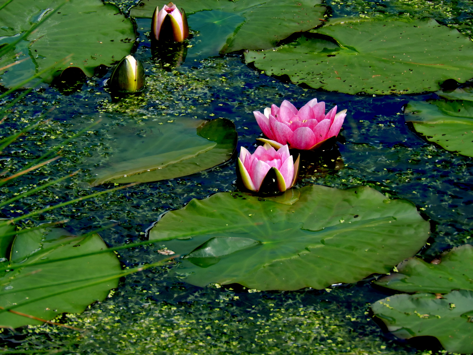Inte långt från Viktoriahuset ligger utomhusdammarna. Jag måste se hur det gått för sothönan som låg i sitt fina bo en bit ut i vattnet sist jag var här. Det syntes inte ett spår av boet och två sothöns simmade och dök i dammen som om inget hänt. Vattenytan är nu täckt av röda och vita näckrosor.