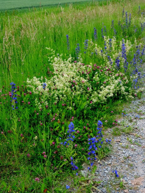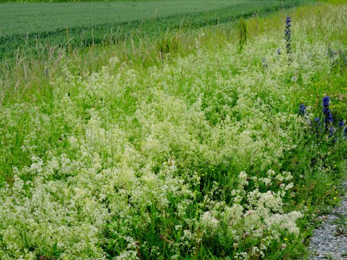 Blåeld , rödklöver och buskmåra (stormåra), om det är någon mer som har sin dag idag, så är det väl buskmåran, den är överallt i gräset utmed vägkanten med sina vitvispade skyar. Den som växtfärgar vet att man kan färga rött med vitmårarot , den ger samma färg som krapp men inte så skarpt rött. Sen upptäcker man att vitmårans rot inte är så stor och då prövar man en annan måra som är vit och som har rejäla rötter.