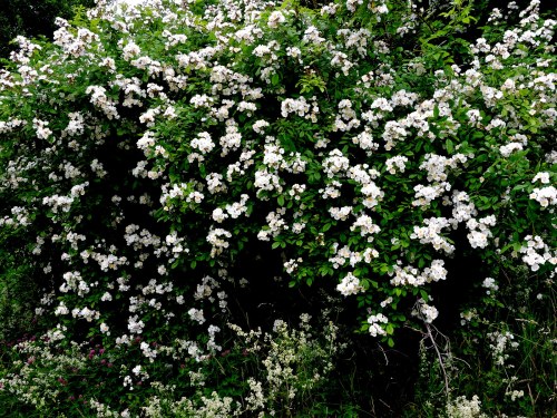 Slänten består antagligen av ditforslad jord, när man byggde upp vägen som går över järnvägen och i den finns buskar och annat som inte växt vilt hos oss. Den här vitblommande jättebusken vad kan det vara?