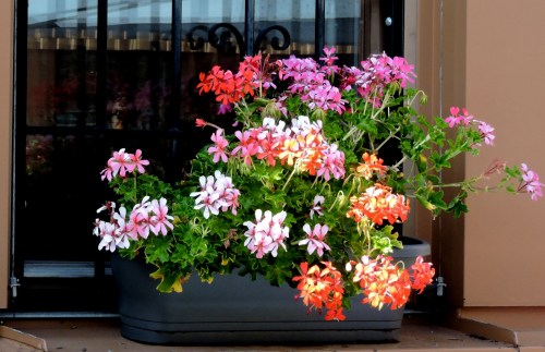 Förutom höjda blombäddar, klättrar rosor högt mot väggarna och man passerar en pergola full av vin med mognande druvor och rosor som nog varit med sedan trädgårdens födelse, vatten porlar någonstans inne i skuggan och det är en skata som är vattenkastare.