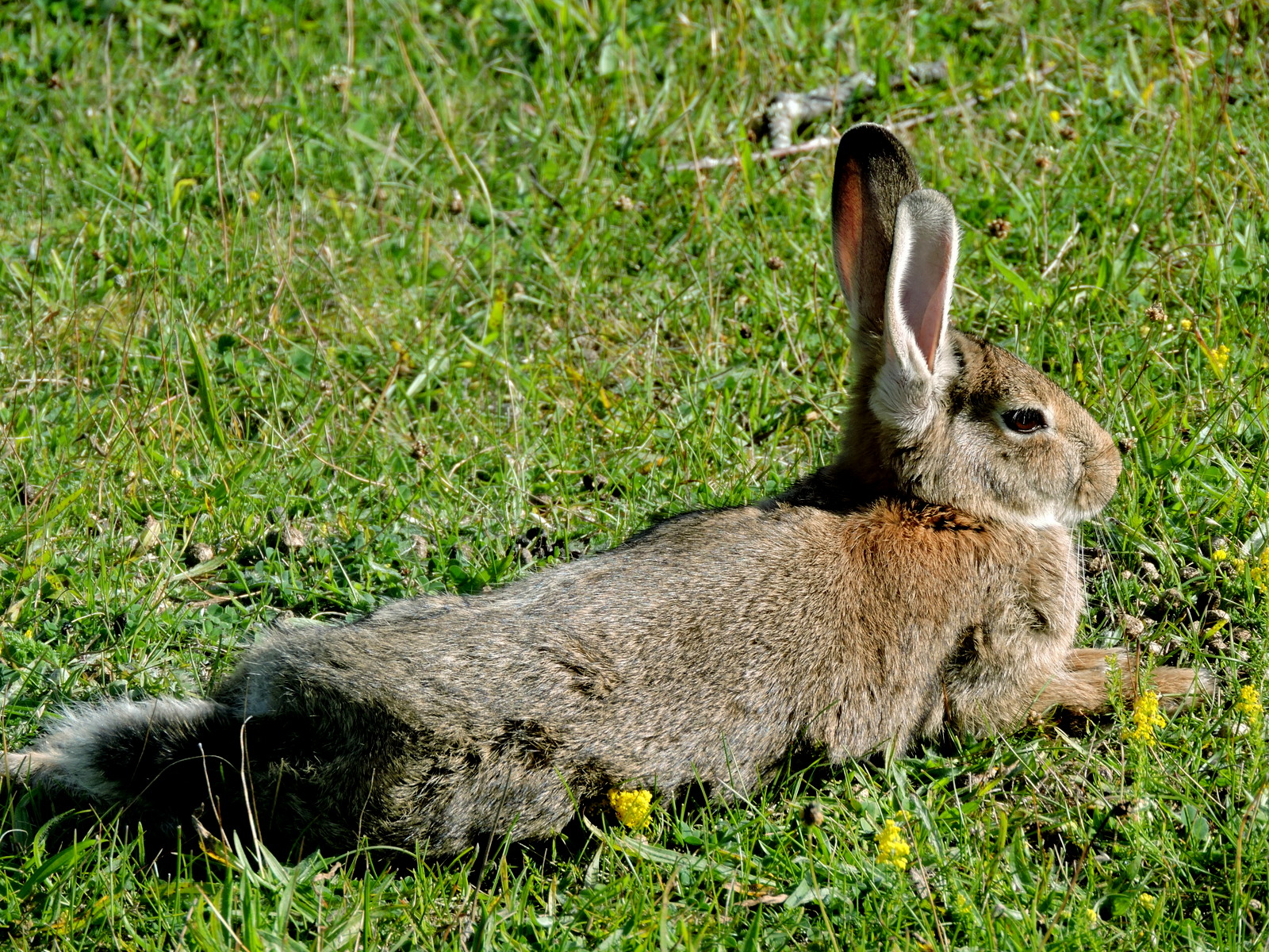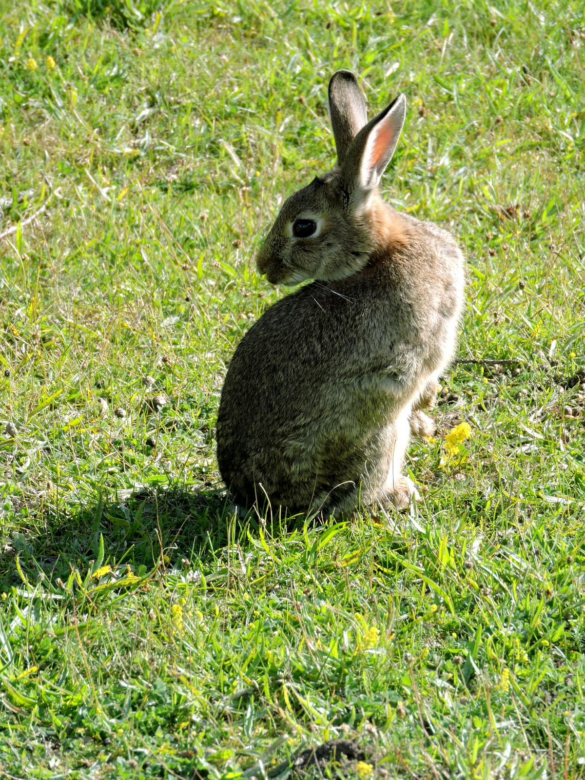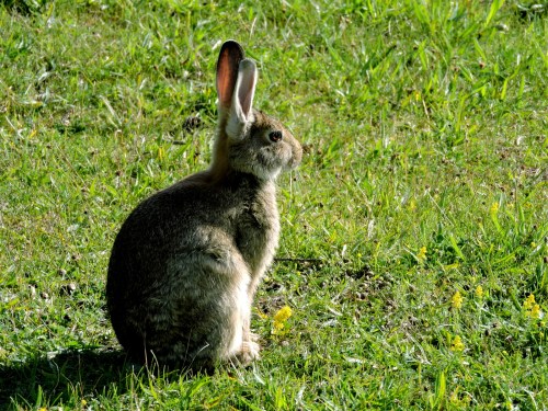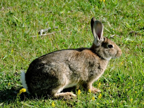 Rabbisarna har överlevt vintern och förökat sig ordentligt, den nya farsot de drabbats av på annat håll har inte nått hit ännu. Resan hit blev fördröjd så jag har oroat mej lite för att hela tomten skulle ha paketerats av snärjmåra och salmbärssnår, men här är avbetat och kort gräs, bara nässelplantorna har fått växa ifred och är manshöga. Här tar rabbisen en paus i betandet