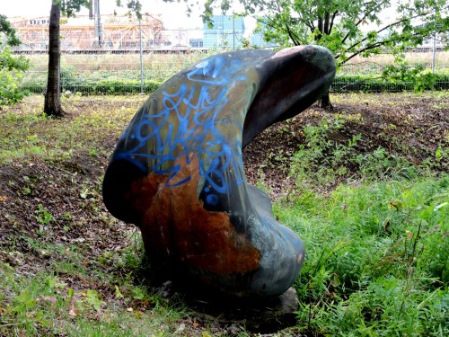 Axel Nordells plastskulptur i sin grop har förskönats med blå färg och det är rensat på marken även kring den.