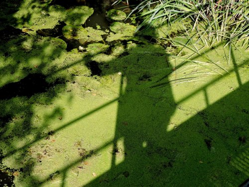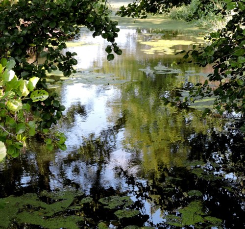 Pölen längst bort var inte jättedjup men jag måste ändå igenom den. Åns yta är grön, en ensam vattenpilört lyser upp det helgröna.