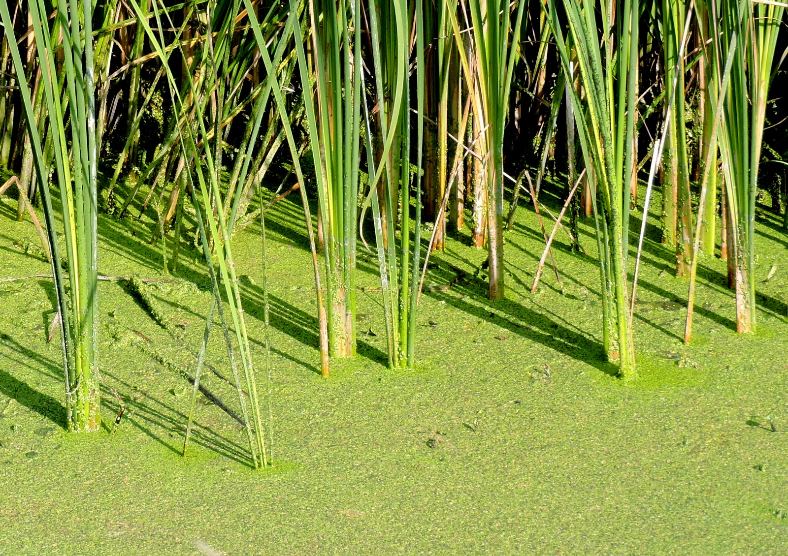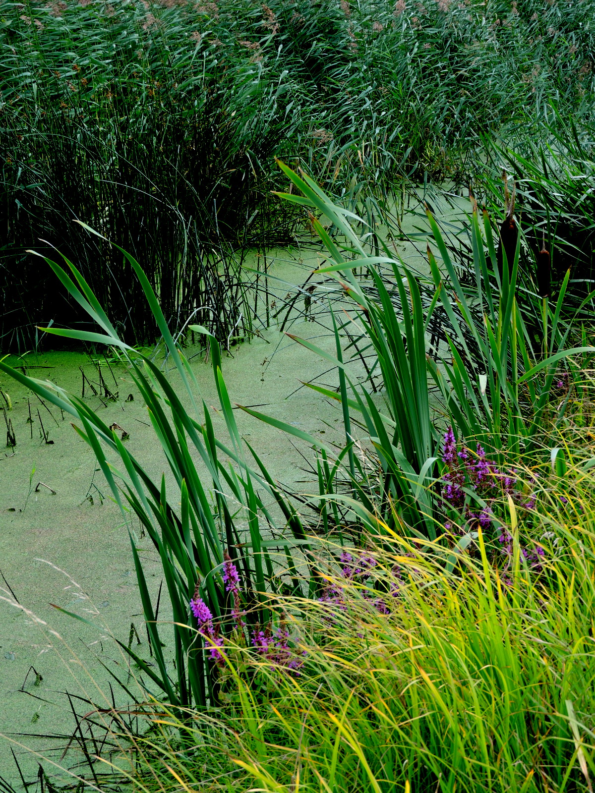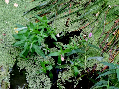 Pölen längst bort var inte jättedjup men jag måste ändå igenom den. Åns yta är grön, en ensam vattenpilört lyser upp det helgröna.
