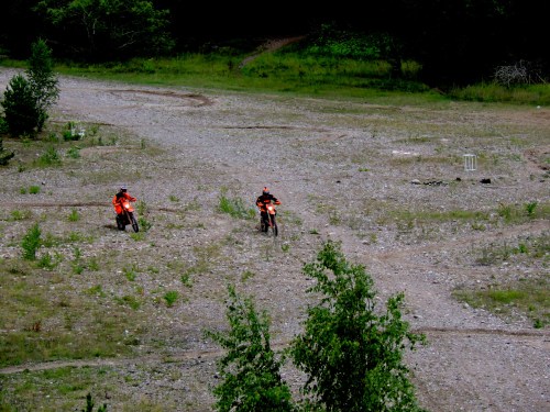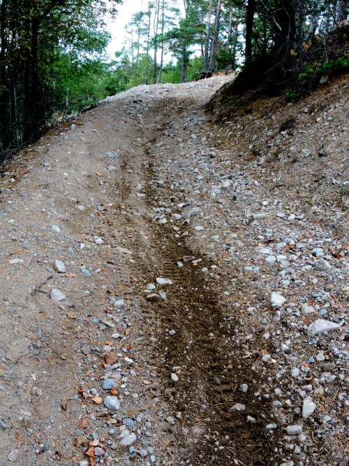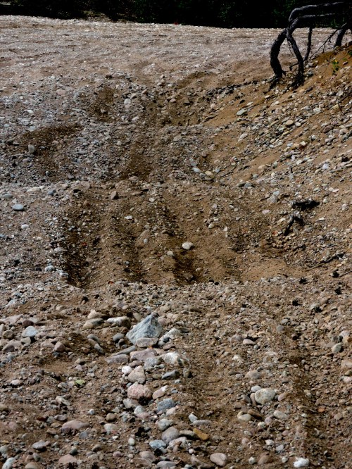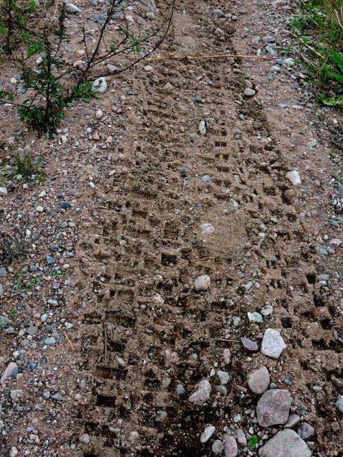 Spår i marken, ganska nyligen har någon kört här, javisst ja man kör enduro i grusgroparna. Har aldrig varken sett eller hört dem och vet inget mer än att de förstör fornminnen (järnåldersgravfält), det har jag läst i lokalbladet.