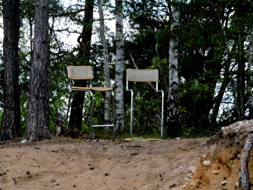 Kan det här vara stolar för några kontrollanter när de har tävling? Lite fattigt att gå omkring och se spåren men inte ha sett dem som gör spåren. Det hörs lite knatter från botten av gropen, tänk om de kommer farande här?