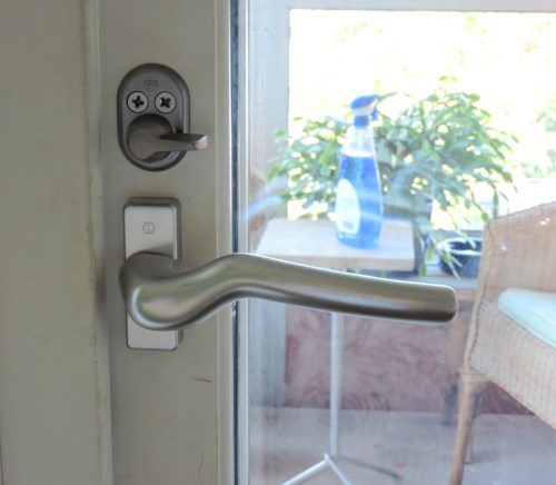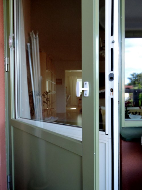 Balkongdörren inifrån. Man kan spärra dörren var man vill med handtaget när den står öppen och det ska man komma ihåg när man går ut, för ospärrad kan den gå igen av draget.