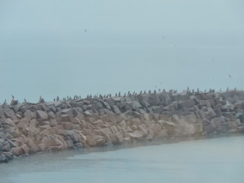 Det sista jag ser av Gotland genom den blöta rutan på färjan till Oskarshamn, uppradade skarvar på en stenpir.