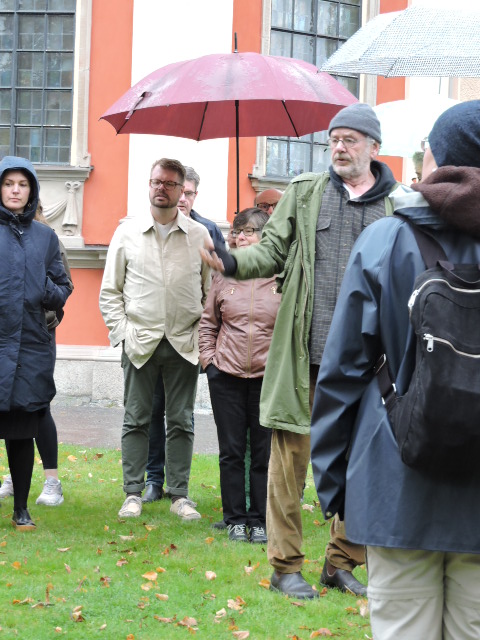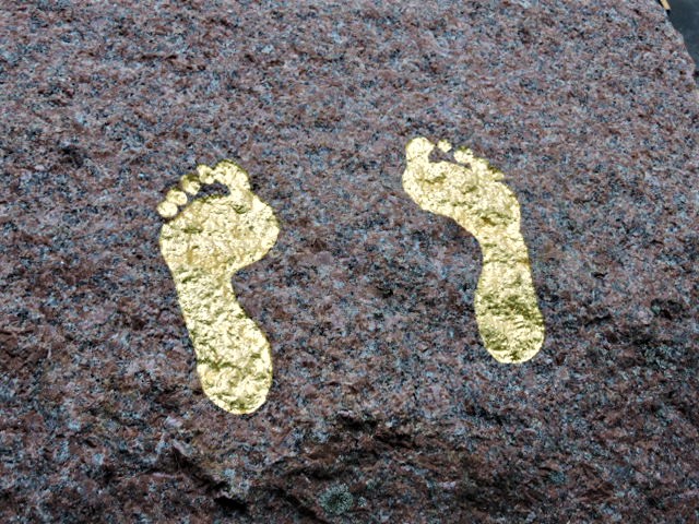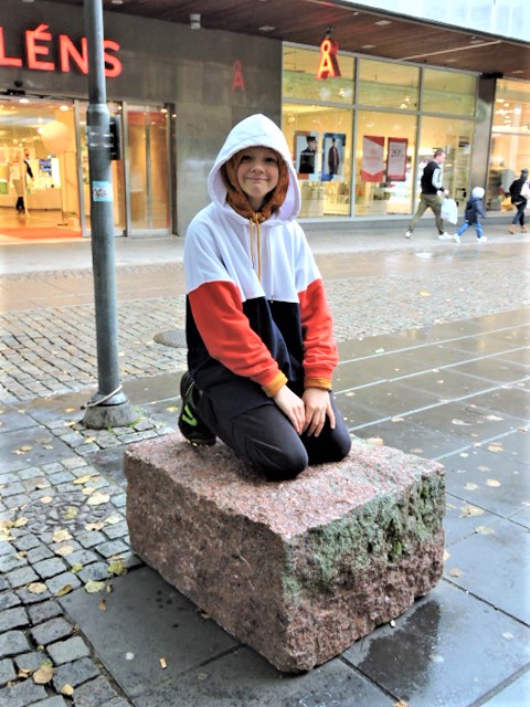 Här berättar Karin Sjökvist Tyrefors om de rosa granitblocken som hon hittade nere vid kanalen där de bygger om och hur hon gärna ville återbruka dem, de fick en ny  funktion som bärare av spår i guld efter olika mänskliga rörelser på gågatan, som jag ser som en enda stor förlängd kyrkbacke. Ett par gamla fötter av en stående, en rumpsits av en sittande och gropar efter knän och tår av en knästående. Sista stenen ser jag som den bedjandes eller som den knäskurandes eller den betgallrandes.