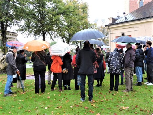 Invigning klockan tre på lördag av konstutställning i Södertälje, kommer du? Javisst det är klart. För säkerhets skull räknade jag in en extra kvart i åktiden och startade i sällskap med P1, i bilen talar radion direkt till mej och jag känner mej delaktig. När jag närmade mig Järva krog norr om stan läste jag en upplyst skylt: tre filer avstängda vid Haga Norra. Hm, vad kan det innebära? Innan jag hann tänka tanken ut fick jag svar, här började en kö som tidvis kom att stå stilla och stegvis flytta sig in mot stan.  Märkligt nog är inte olycka det första jag tänker på när filer stängs av, utan gatuarbeten. Nära Haga Norra stod sedan två små hopskrynklade bilar där köerna skulle krympas och två bilägare har förutom kanske skador på sej själva fått oväntade hål i plånboken.Jag kom inte fram till vare sig invigning eller att se tre av utställarna. Alla ställde ut i gaturummet och man gick på visning från den ena till den andra och regnet strilade. Här visar konsnären Anders Widoff  sin installation på kyrkbacken. Kyrkbacken var förr en mötesplats för alla och genom att vi hade kyrkogångsplikt (till 1809), nådde man stora delar av befolkningen där. På kyrkbacken köptes och såldes och vid stora högtider var det marknad, här pålystes och kungjordes sådant som överheten ansåg att vi borde veta. Lagens bud skulle vi själva hålla reda på då ännu få kunde läsa. Mänskliga rättigheter, som var inspirationen för utställarna, blev man tillsammans med skyldigheter upplyst om på kyrkbacken.