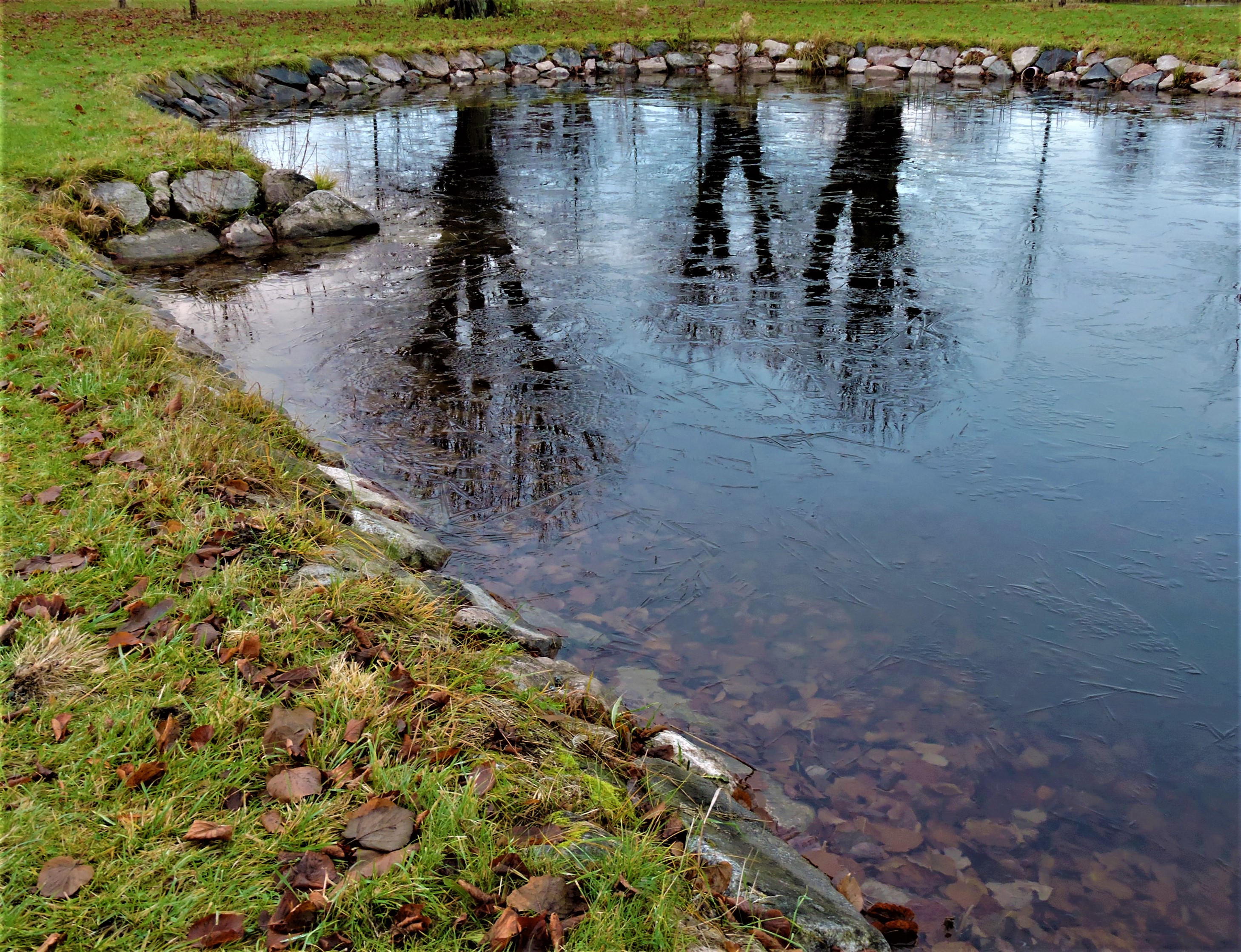 Vattnet fryser randigt och strimmigt så speglingarna blir trasiga.