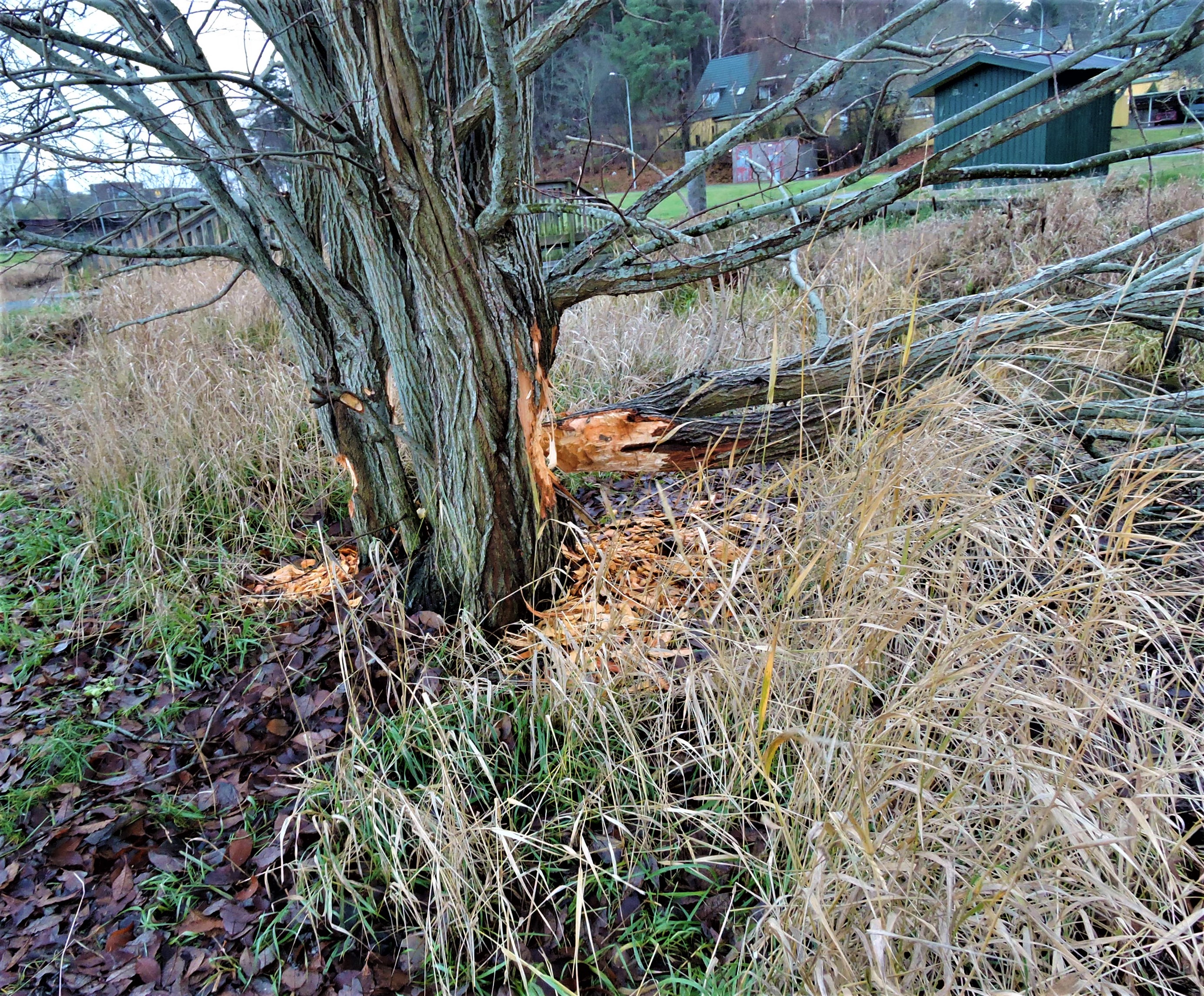Alldeles innan vi kommit runt lyser tuggat trä lång väg, en gammal sälg har fått påhälsning av