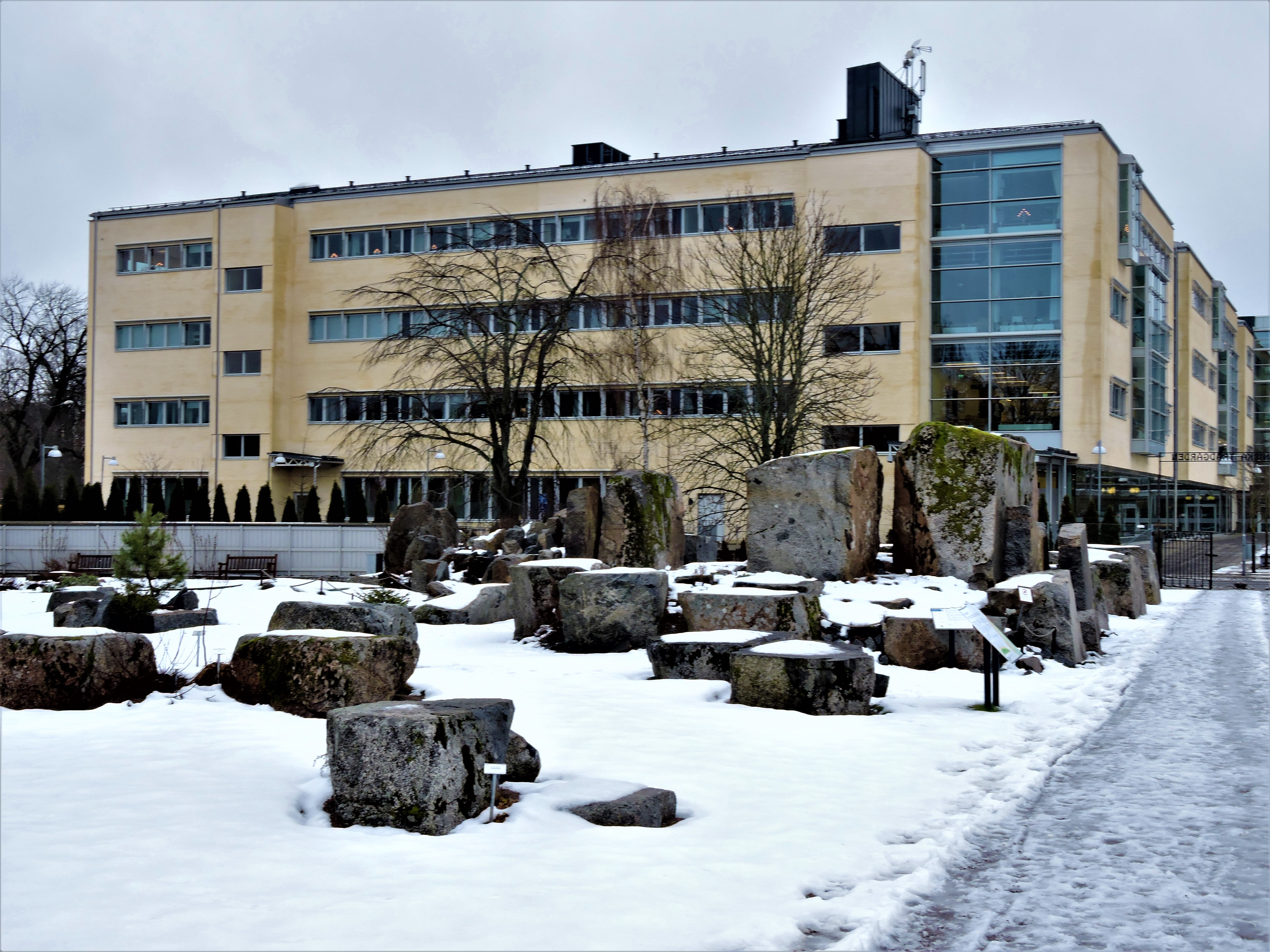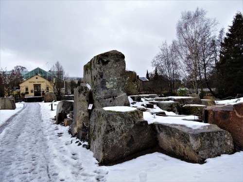 Stenblock med planteringar emellan och ingången till tropiska växthuset i bakgrunden. Om man vänder sig om har man en helt annan utblick just nu när löven saknas.