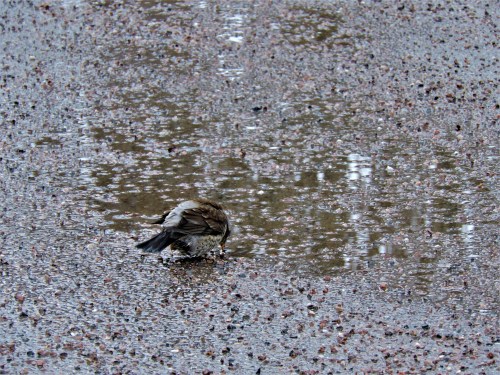 Lördag i december, jag har siktat in mig på att besöka Orangeriet i Uppsala Botaniska trädgård för att ta bilder av Linnés lagerträd som förvaras där över vintern. Vädret är precis som det ser ut kring den ensamma björktrasten, vatten som tränger in i skorna nerifrån och i kameran ovanifrån och sen visar det sig vara stängt i Orangeriet, vad gör jag?