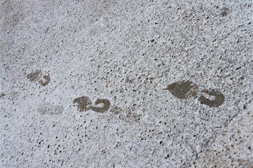 Det blir fina spår efter skor med reliefsulor en sådan här dag. Man vänjer sig vid olika mönster och ibland urskiljer man något man inte sett på ett tag. De här ser ut som spåren efter de små hästarnas plåtskor, som man grävt fram i Eketorps borg på Öland.