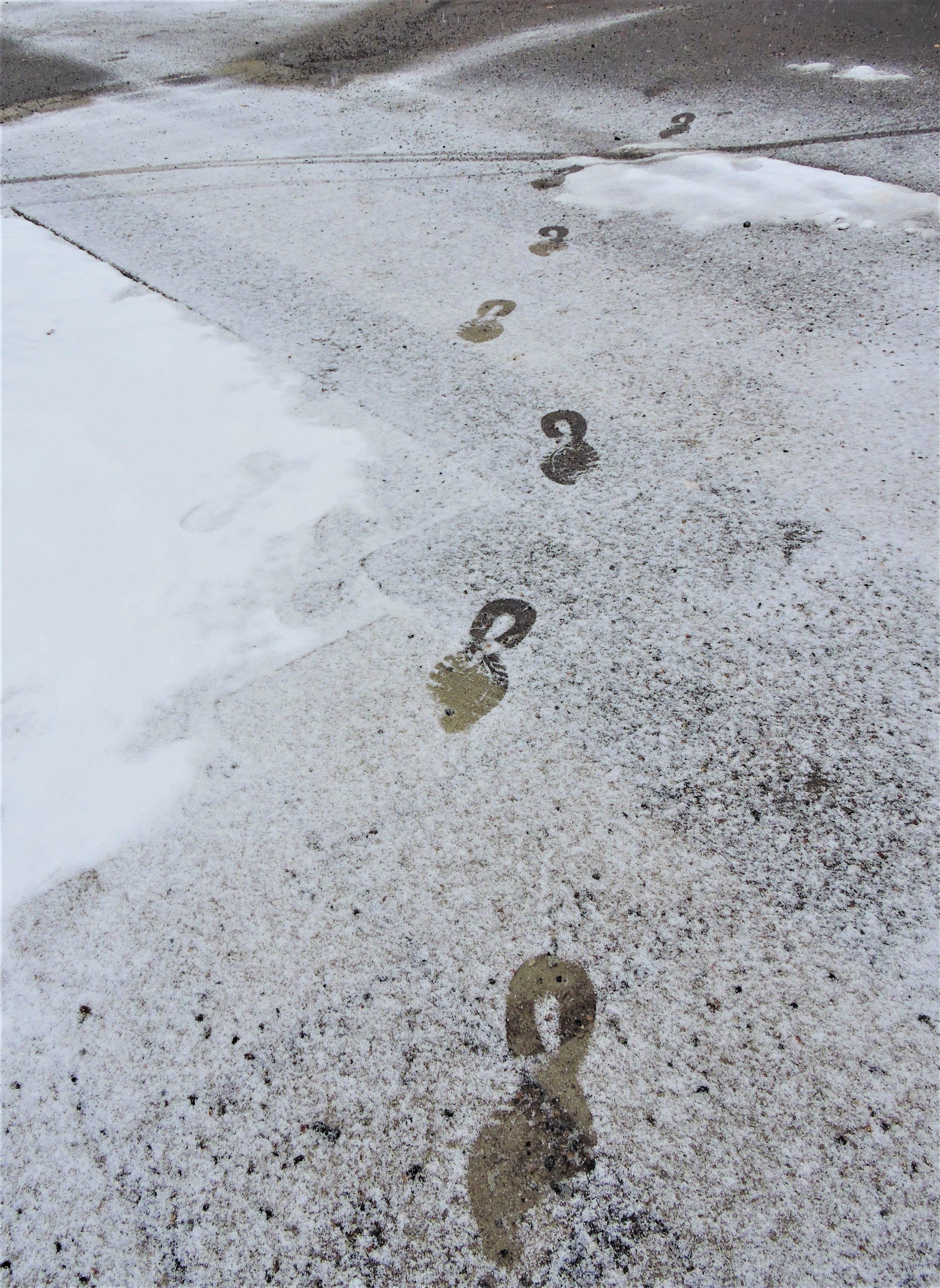 Det blir fina spår efter skor med reliefsulor en sådan här dag. Man vänjer sig vid olika mönster och ibland urskiljer man något man inte sett på ett tag. De här ser ut som spåren efter de små hästarnas plåtskor, som man grävt fram i Eketorps borg på Öland.