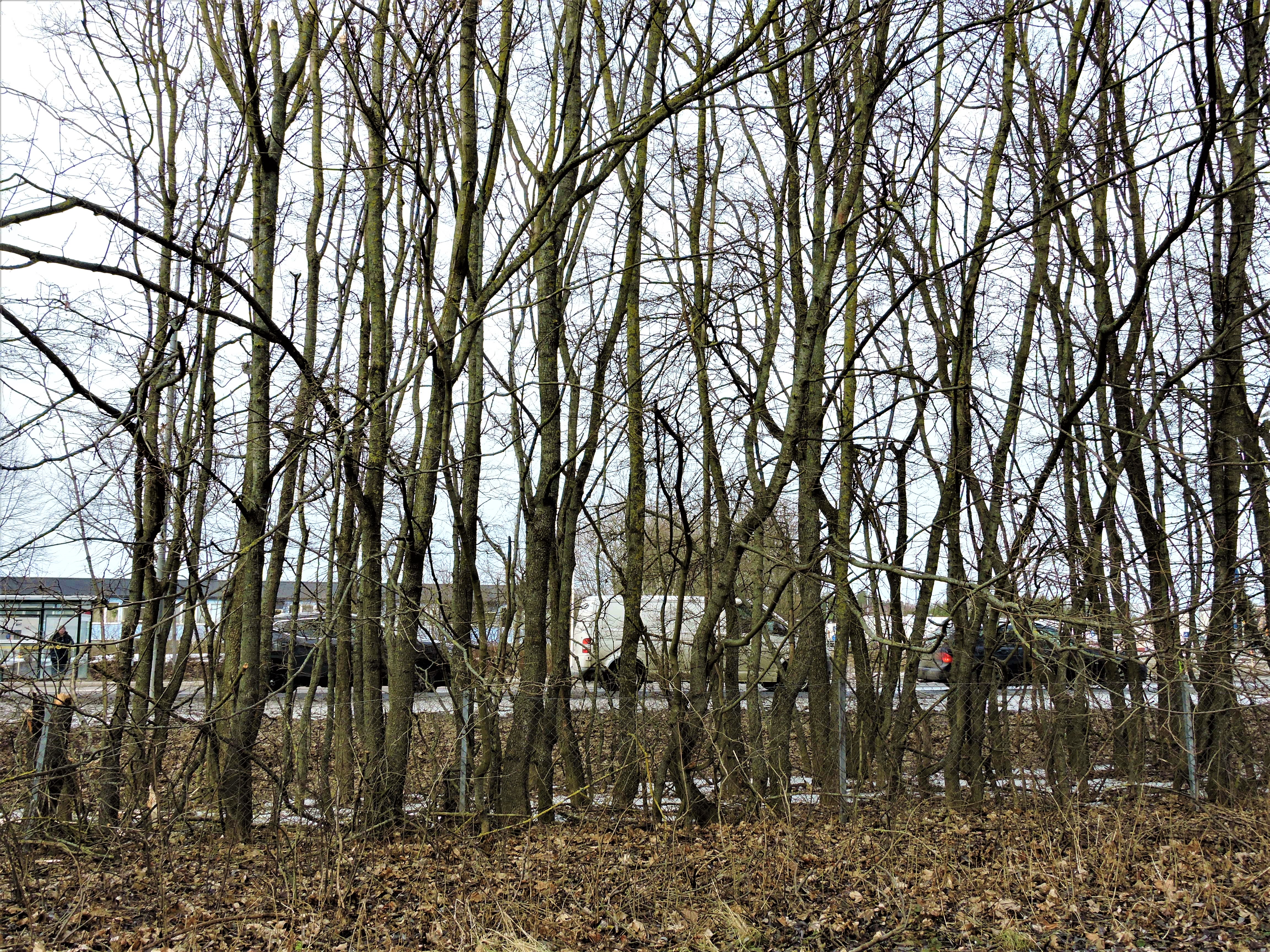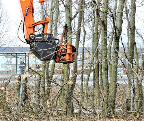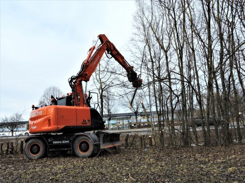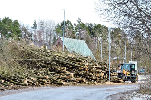 Mälarvägen går till och från E4 och har de senaste åren varit en grön tunnel av förväxta buskar som dolt bebyggelsen på båda sidor om vägen. Vi har sett det positiva i att den före detta häcken stått där och och med sin lövrikedom har fångat upp alla partiklar och avgaser från gatan och renat luften åt husen bakom. Nu ska bebyggelsen förtätas och här ska flera husrader byggas och för någon vecka sedan hade bilden av Mälarvägen förändrats. Buskträden på ena sidan var borta och i förgår hade man börjat kapa även på andra sidan. Jag tog aldrig någon bild på den enorma gröna lövtunneln när den var som tätast och tänk om jag nu dessutom missat nedsågningen av alltihop. När jag kom förbi idag , var en maskin igång med att klämma av de sista 50 metrarna av en mer än 40-årig häck som tillåtits växa fritt på höjden.