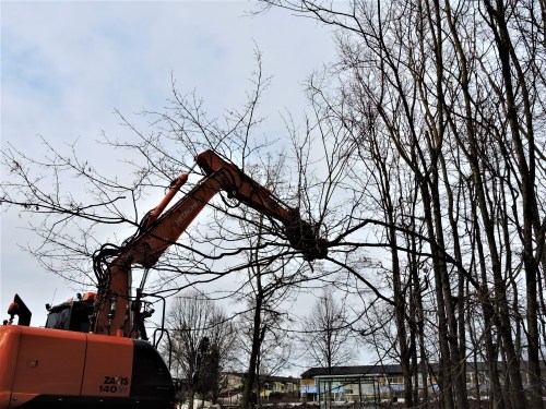 Bilen svängde alldeles själv av och in på gatan bakom så det gick att ställa den och se bättre. Maskinen sågade inte utan klämde sönder grenar och stammar och bar iväg dem. Här kom svaret på en fråga som Lasse och jag ställt oss, hur gör de när det här ska bort en dag?