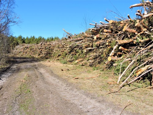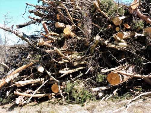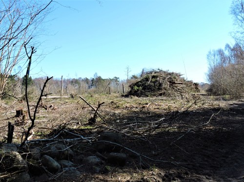 I år var vägen från brevlådorna till oss bredare och beströdd med strandgrus, maskinerna i jordbruket blir större och större och behöver stadigare underlag. Jag gick en liten promenad i markerna för att leta upp en vitsippsmatta från förr och överraskades av ett kalhygge som öppnade sig helt oväntat. Rubb och stubb jämnat med marken och upplagt i enorma stackar, tjocka och smala träd om varann. I riset överst flaxade koltrastarna och försökte hitta sina bon eller något att äta, störda verkade de i alla fall. Den mjuka sandjorden hade gett vika för maskinen och där det förr var en cykelstig var nu helt sönderkörd mark med sjöar i de breda traktorspåren. Brutalt.