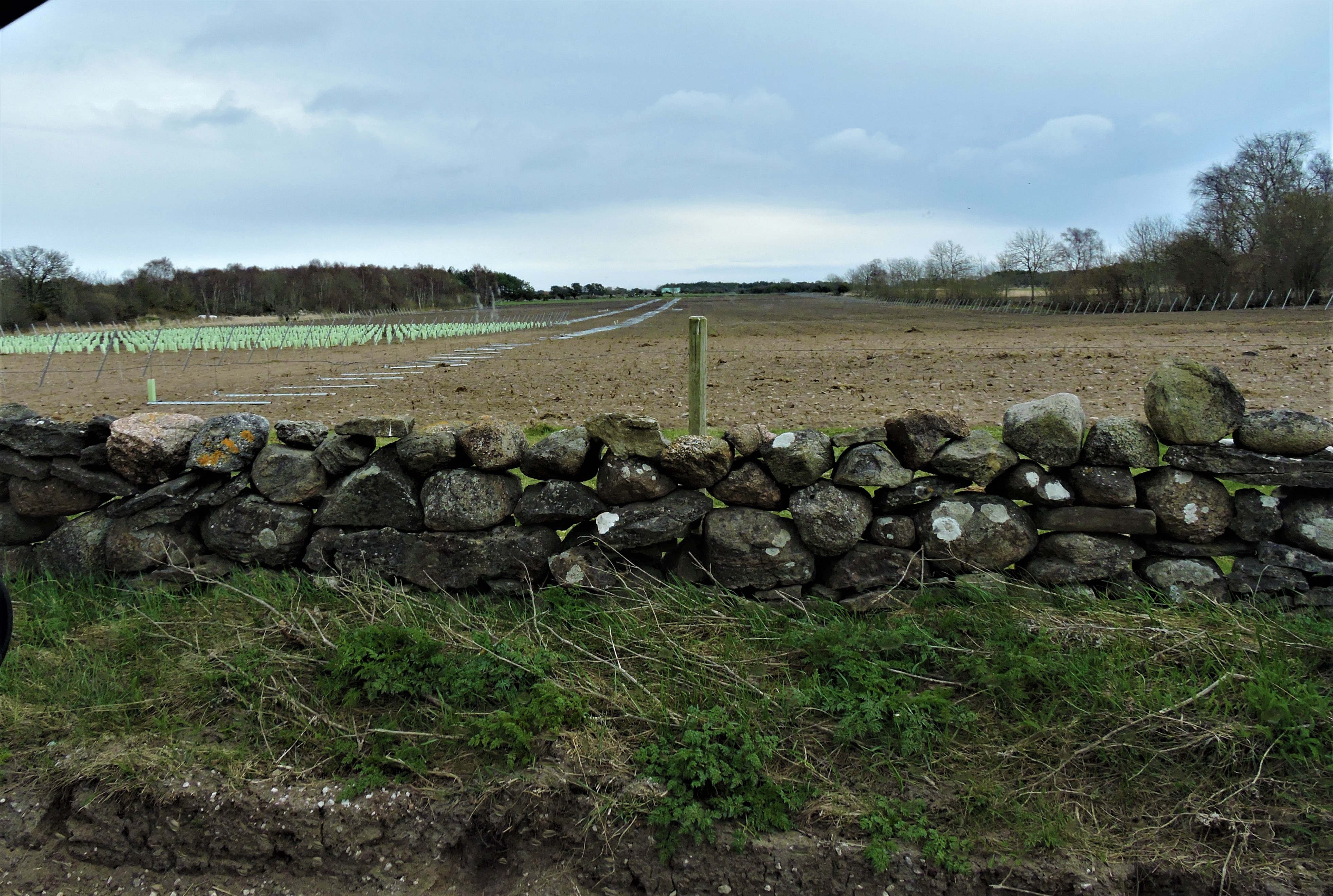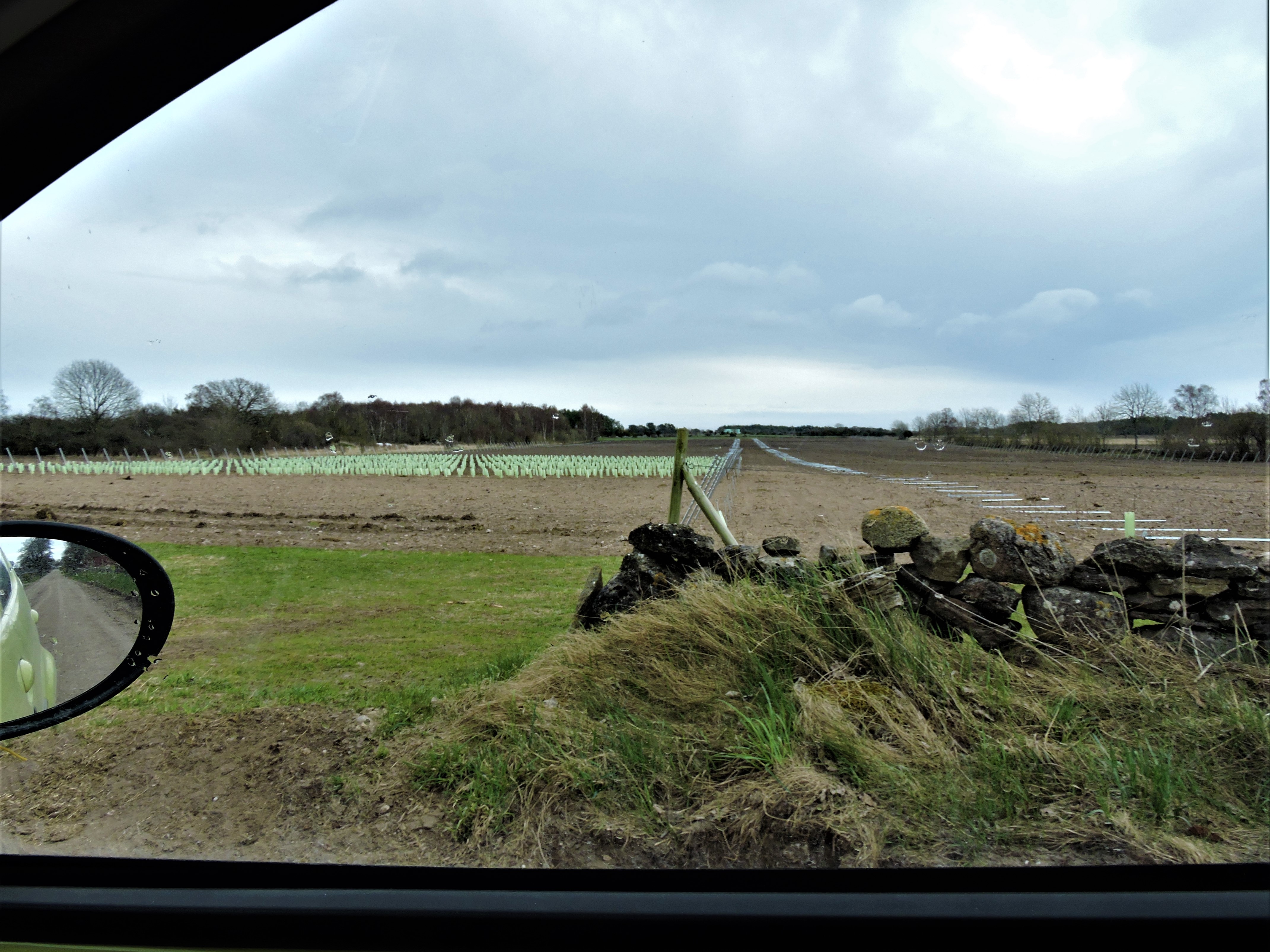 Det är bara någon kilometer härifrån, nästan grannar. De planterar vinplantor, det är ganska modigt men antagligen vet de vad de gör. De började för ett par dagar sedan och när jag åkte förbi igår hade de hunnit en bra bit. Det är det grönaktiga på fältet som är gröna påsar kring plantorna