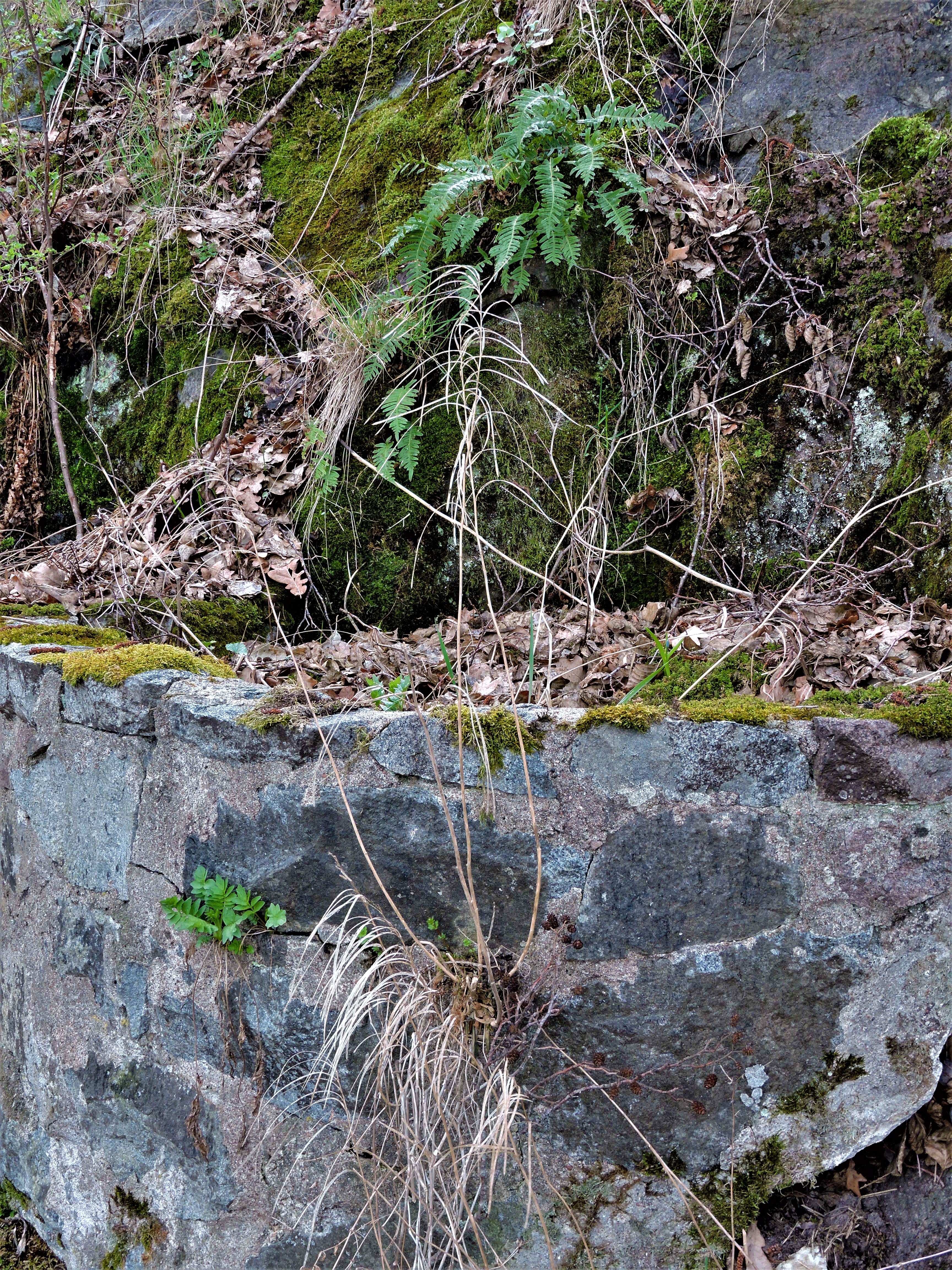 Mer än 100-åriga stenkrukor för ormbunkar på och utmed det branta berget i norr.