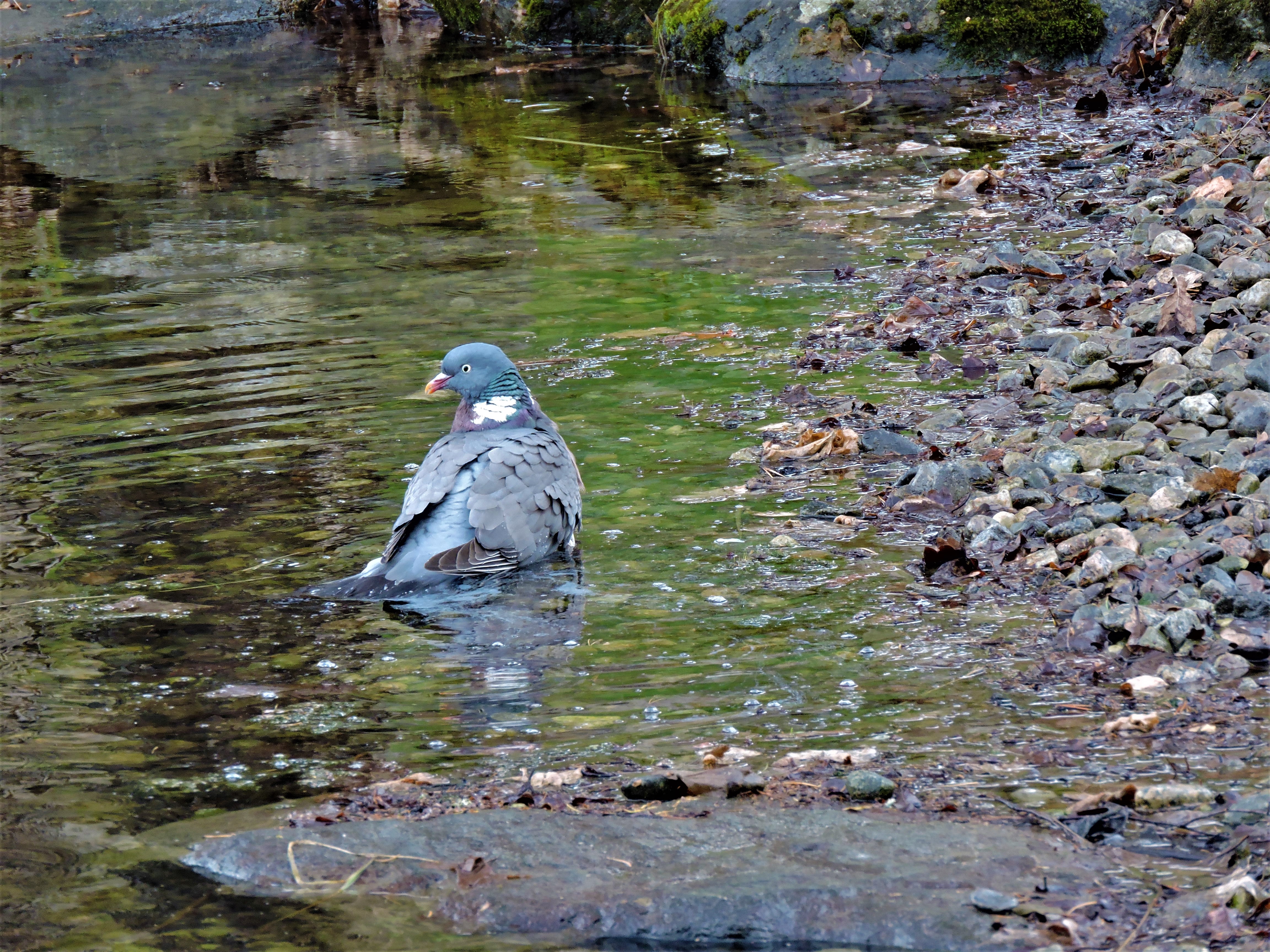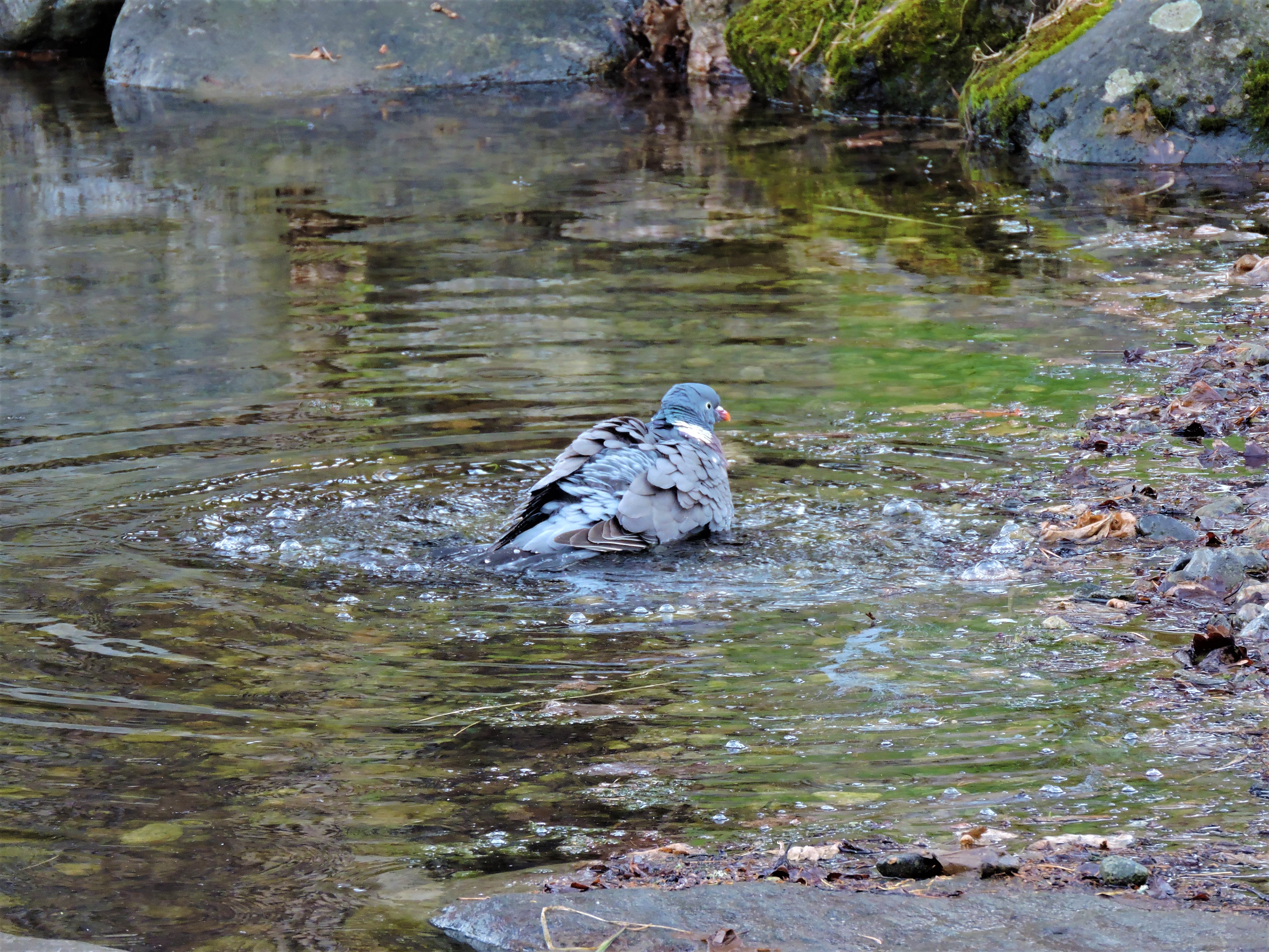 Något pågår i japanska dammen, två duvor badar. De skvimpar och skakar fjädrarna i vattnet och visar upp vingarnas insidor.