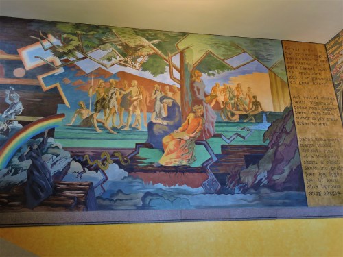 De stora väggmålningarna som skymtar ovanför trappan glömde jag att läsa av namnet på
