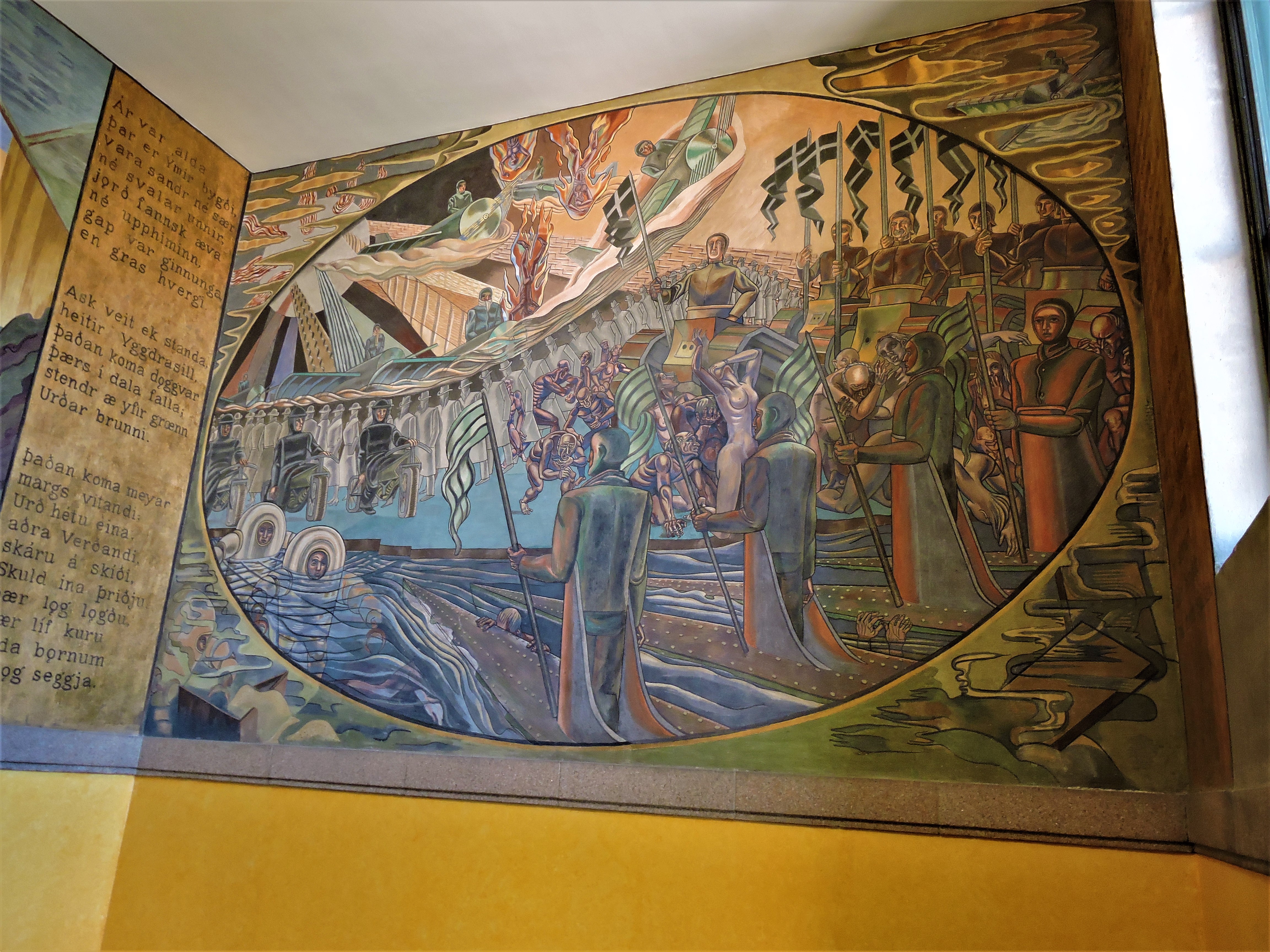 De stora väggmålningarna som skymtar ovanför trappan glömde jag att läsa av namnet på