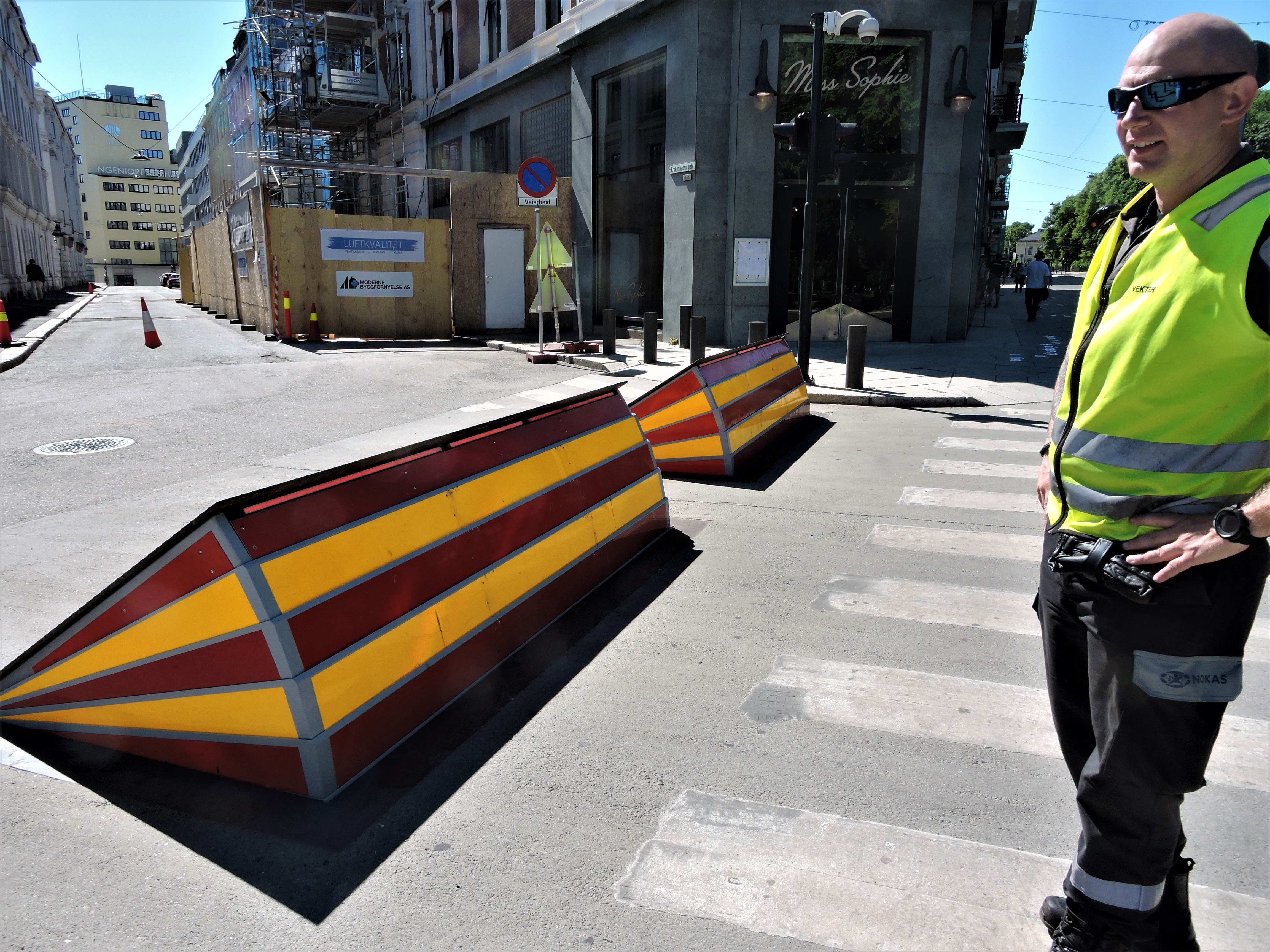 En tvärgata var avstängd för trafik med gulvästade vakter och något stod upp ur gatan som spärr. Sen kom en bil som skulle släppas förbi och hindret sjönk ner i gatan styrt av den gulvästade.