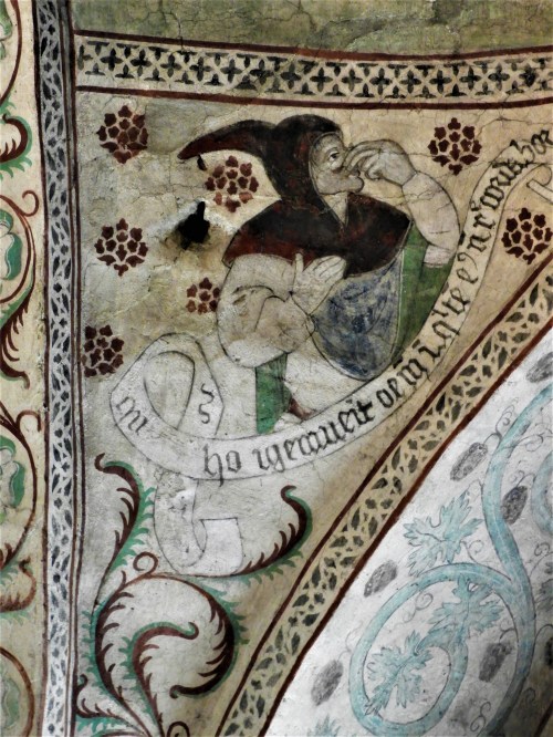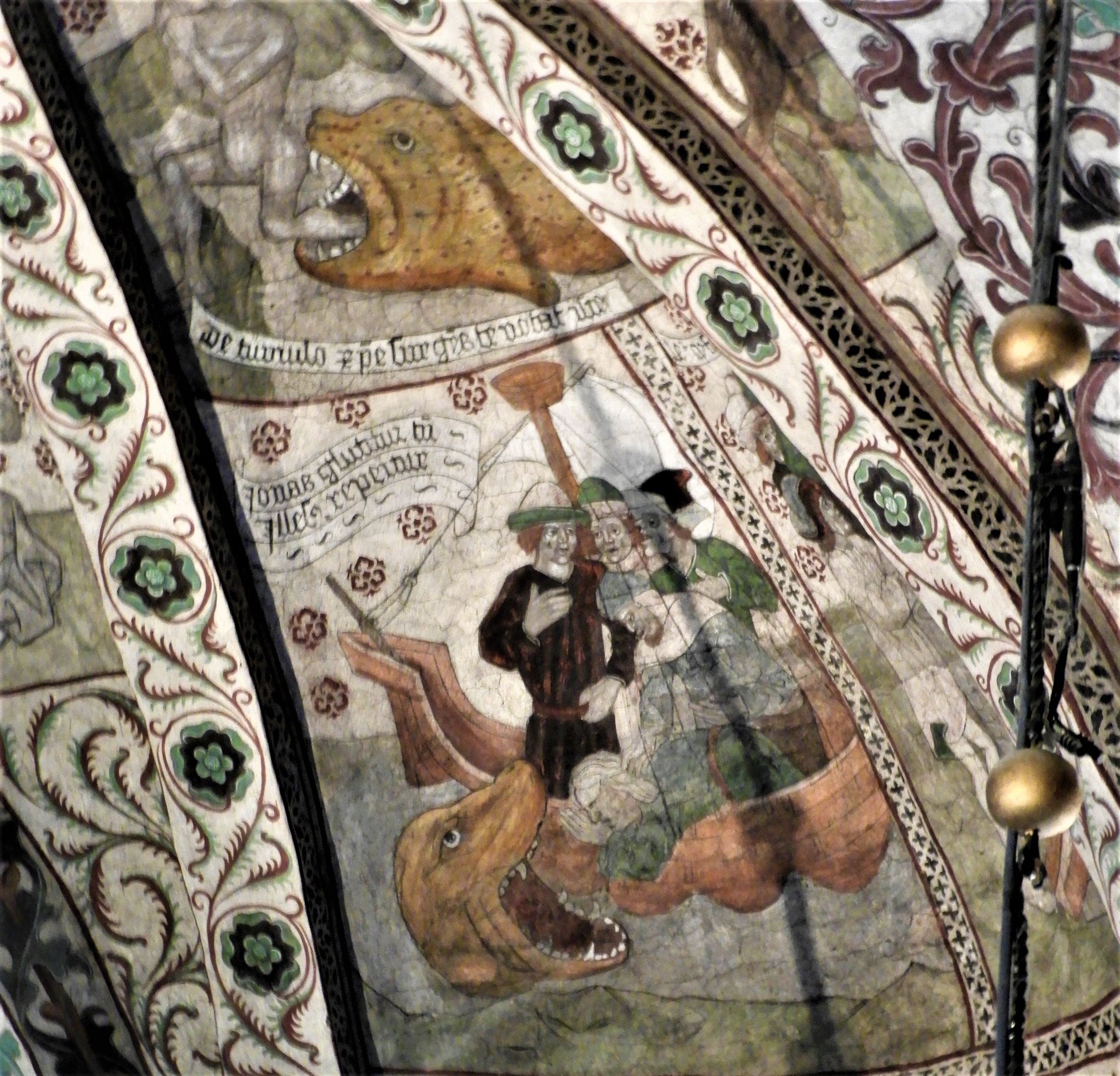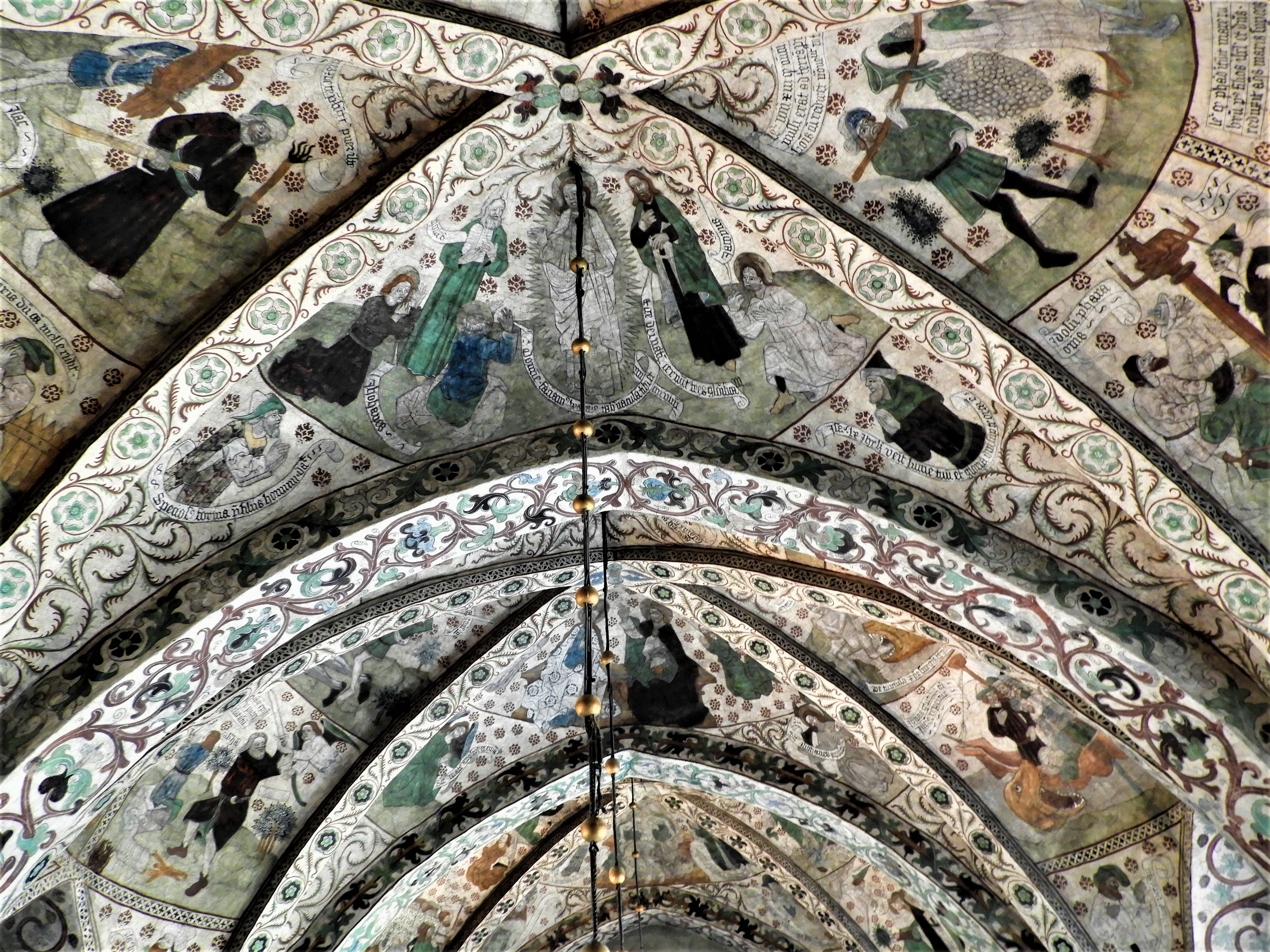 Väl inne i kyrkan hade vår guide tänt lampor som belyste målningarna och de färger som fanns kvar var klara och tydliga, rött har åldrats till svart och ansiktsfärg är borta men röda kinder har nu en sotfläck. Kläderna på bibelns folk är 1500-talets och daterande men ansiktena kunde ha hämtats i Väsby Centrum i förrgår.