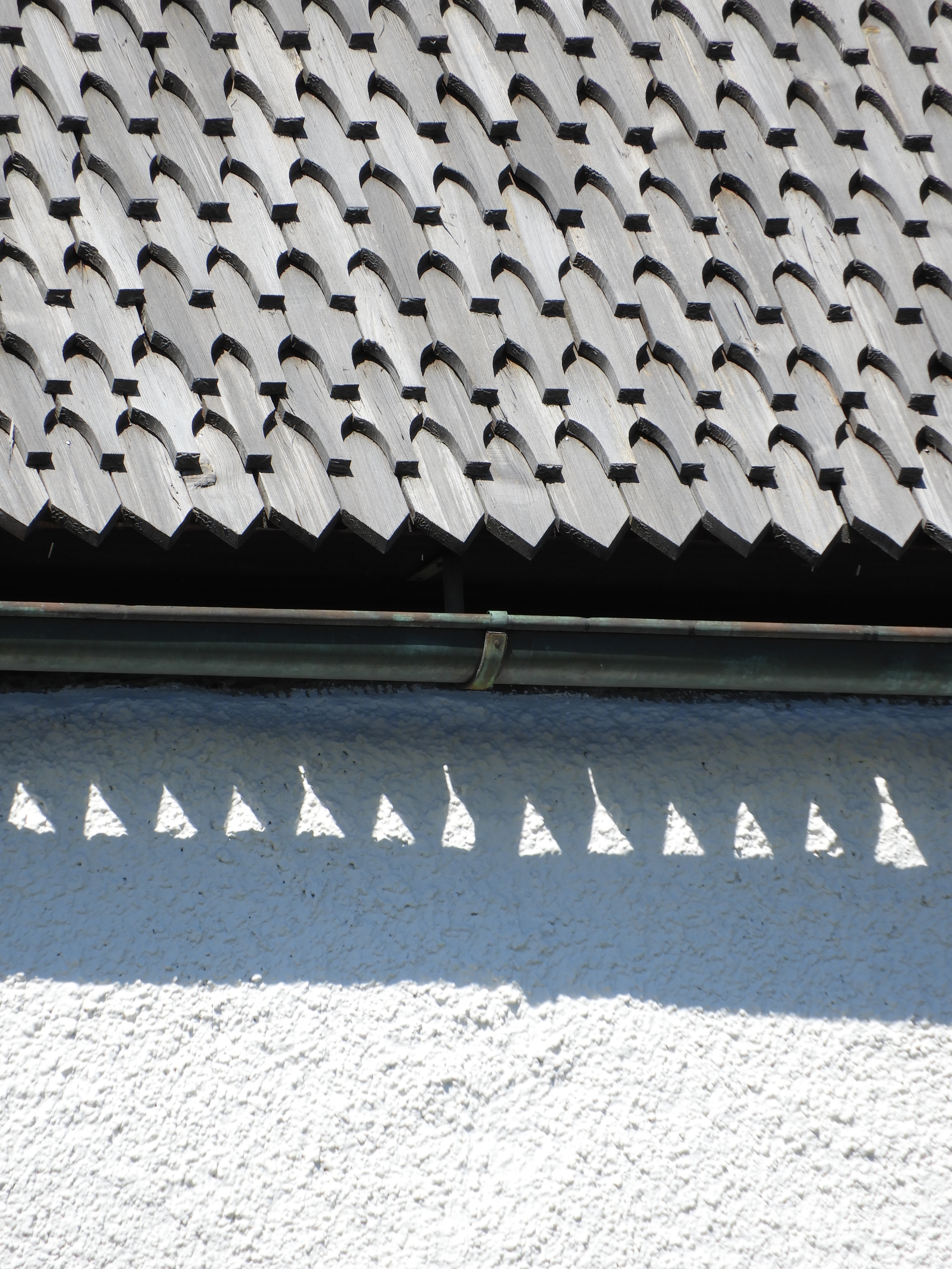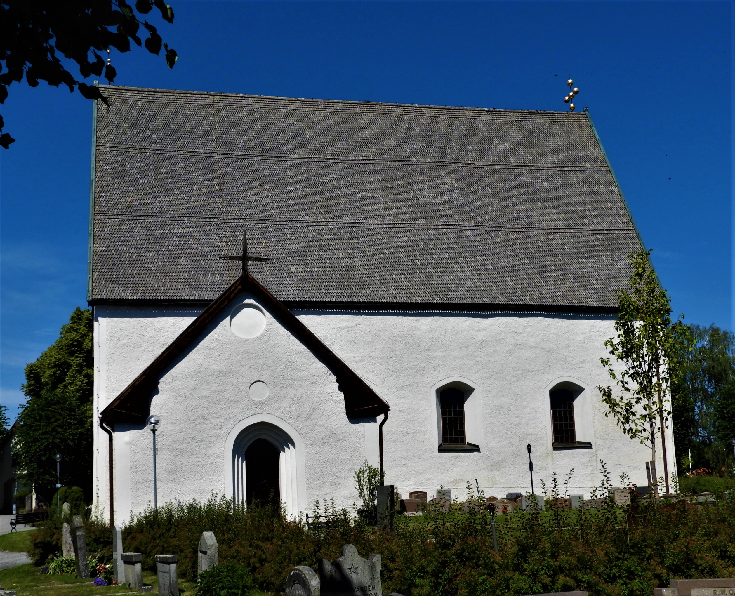 Kyrkan har brant tak, någon eller några har lagt spånen på taket.