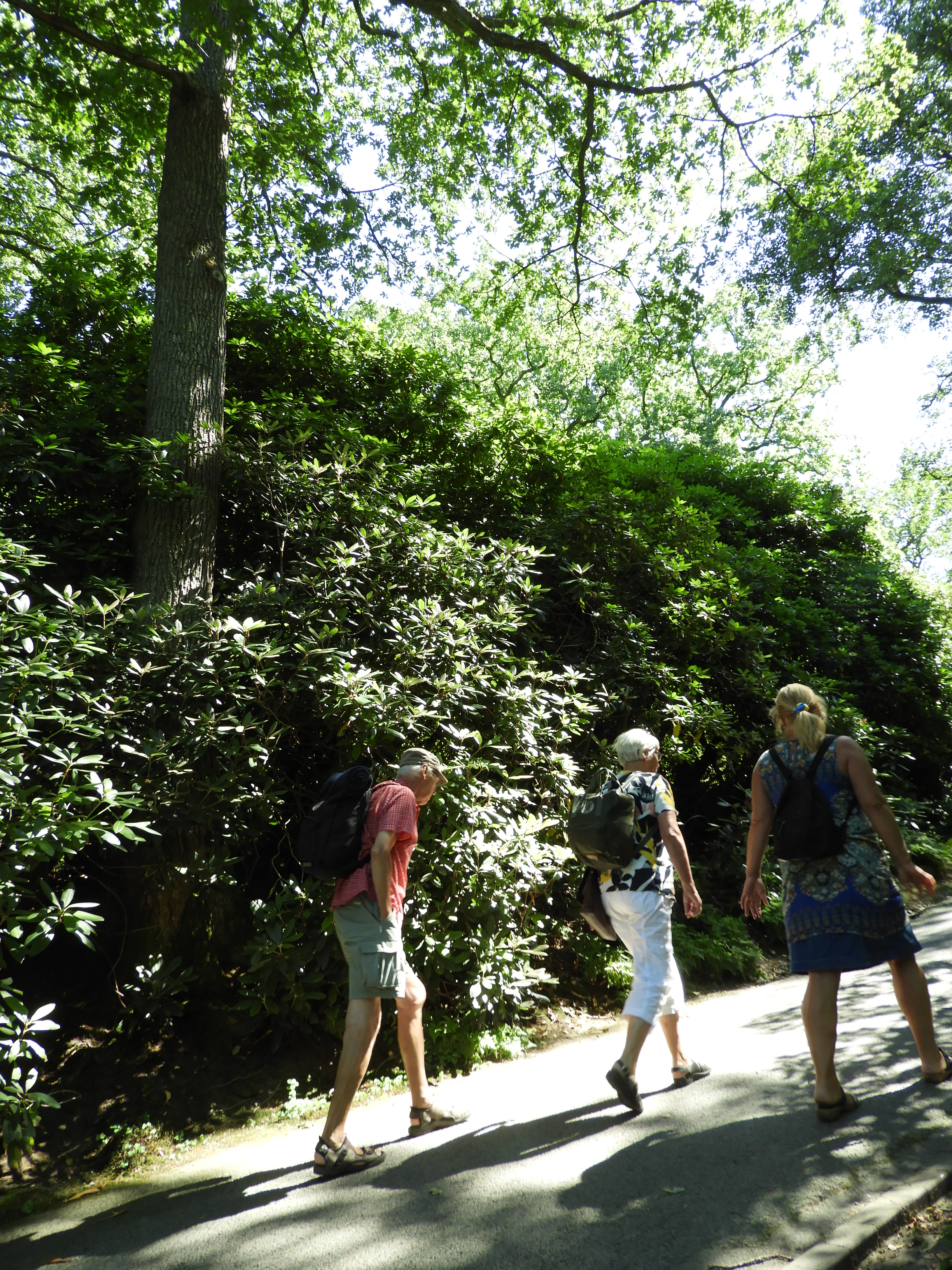 Jättelika Rhododendronbuskage i Rhododendrondalen och rum med bänkar inne i buskarna