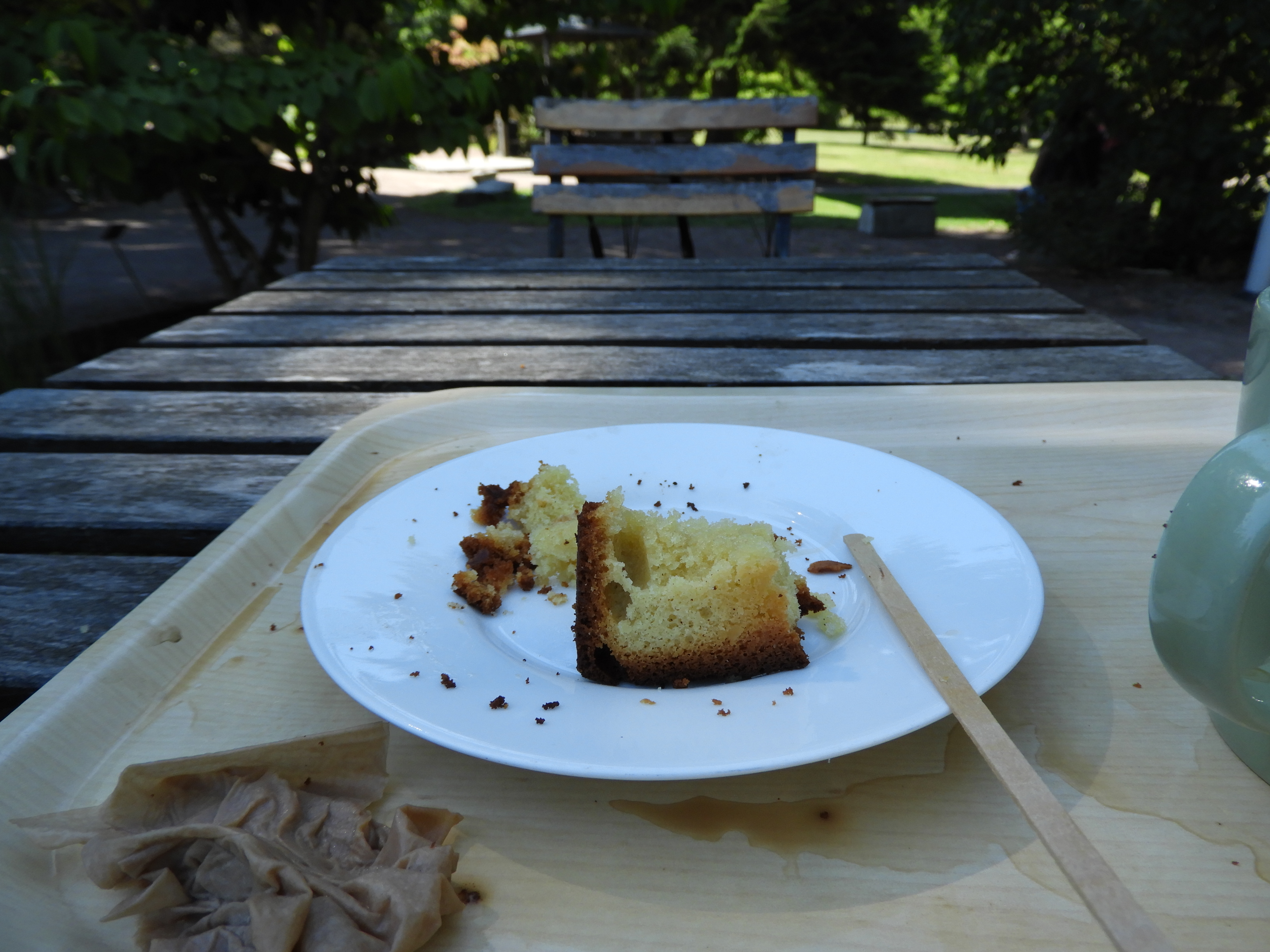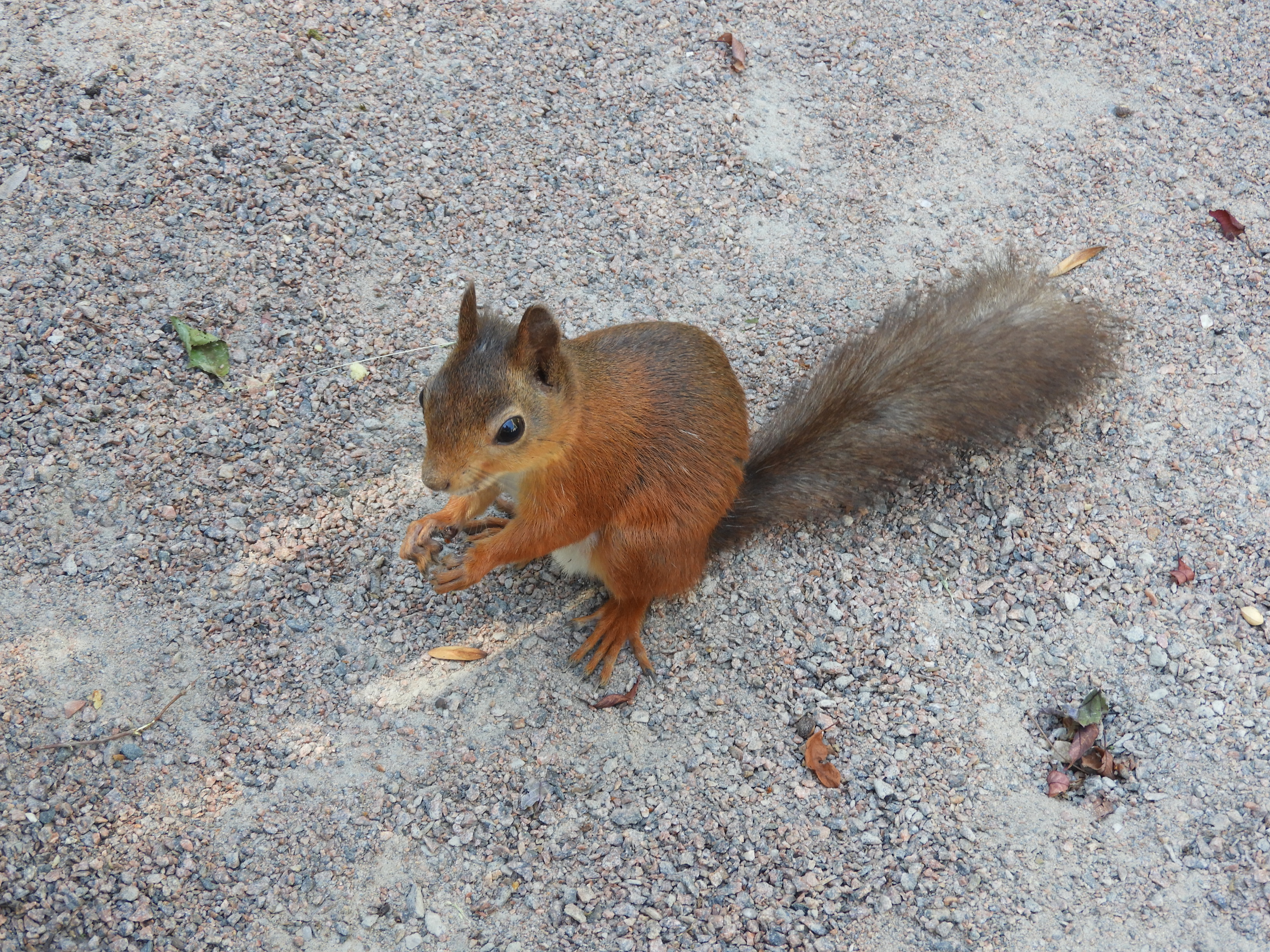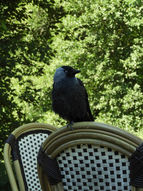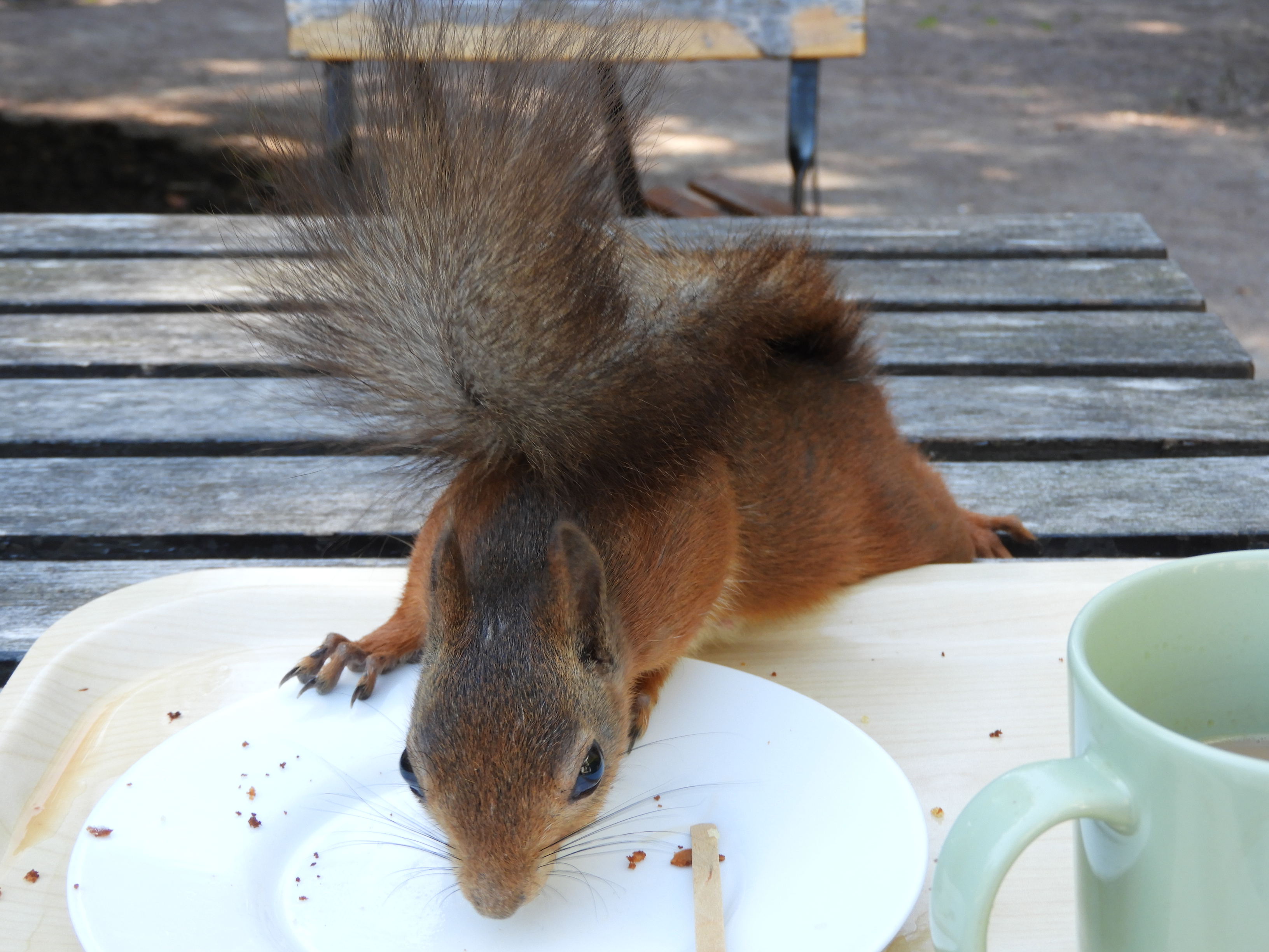 En kopp kaffe hör till ett trädgårdsbesök och när jag satte mig ute med koppen och en sockerkaksskiva blev jag genast inringad av två ekorrar, två kajor och en talgoxe. Ekorrar är jag förtjust i men de här var riktigt fräcka. Först slogs de inbördes om smulorna, sen hoppade de upp och hämtade på tallriken när man tittade åt annat håll. Det slutade med att vi drog båda i sockerkakan och sen var den inte kul att äta. Kajorna väntade tålmodigt och talgoxen likaså och verkade vänta på att någon sa varsågod.