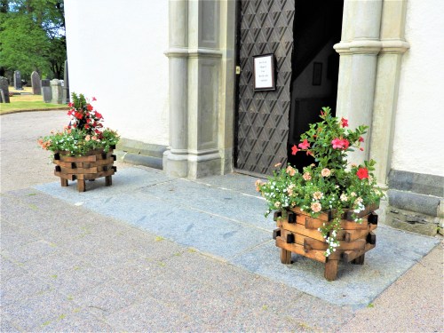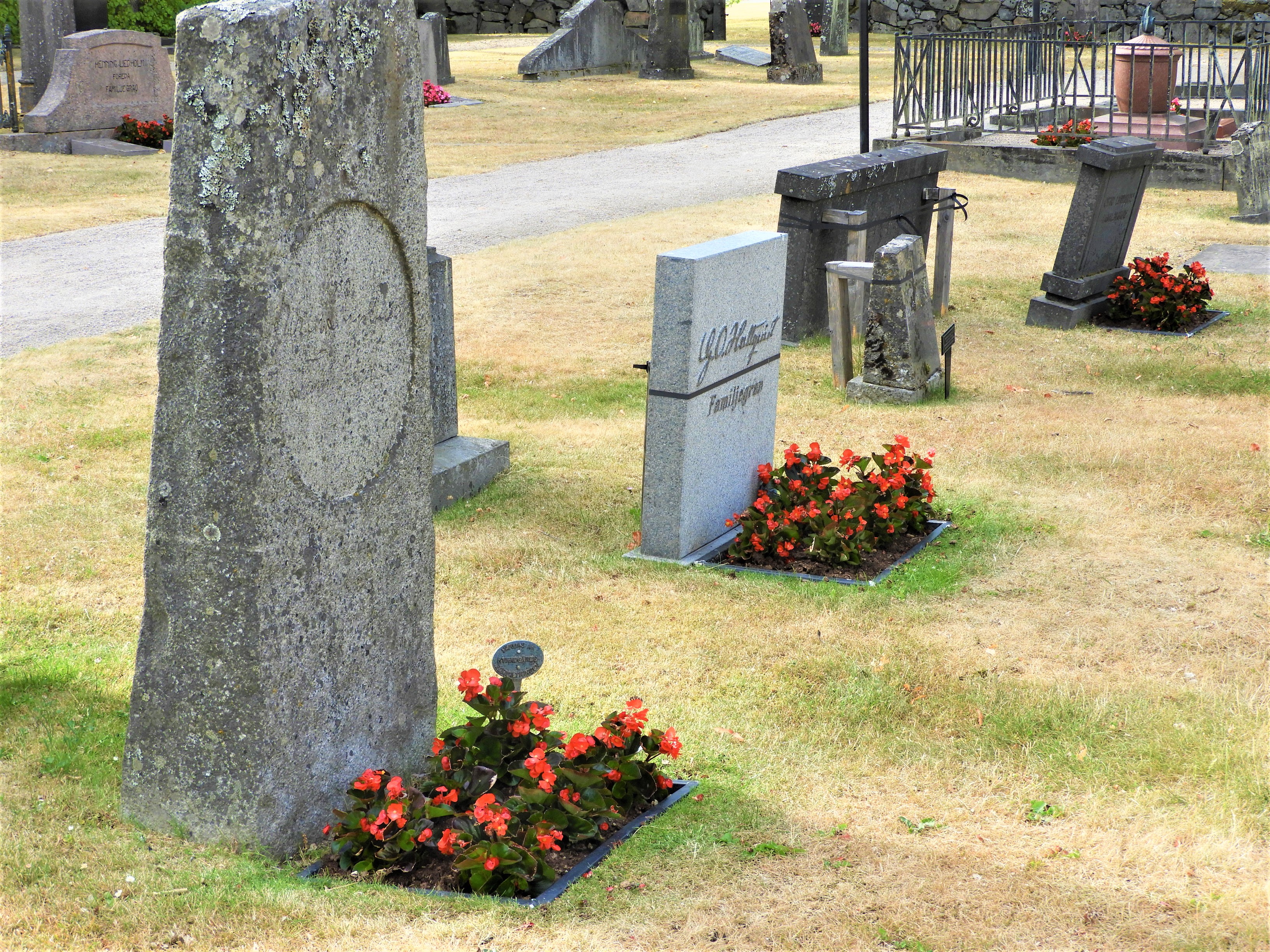 Gick till gamla kyrkogården och där var de gamla gravarna planterade med röda begonior