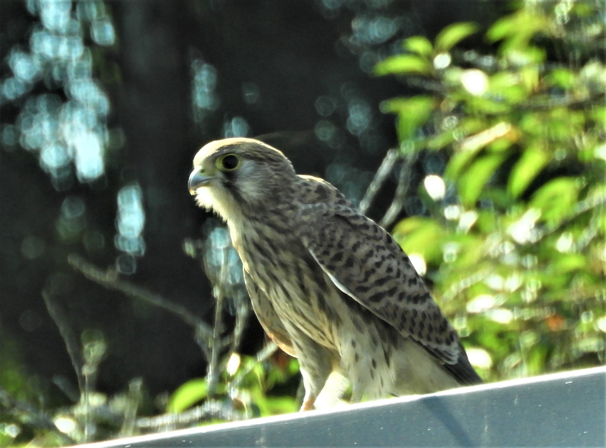 Jag tittade i Lasse Jonssons fågelbok, och den där rovfågeln liknar mest en ung duvhökshane. Duvhökshanarna är ganska små, inte större än sparvhökshonor. Tycker den såg ganska mager ut. Dåligt med mat, eller pressad av värmen kanske?