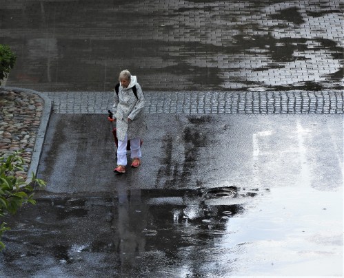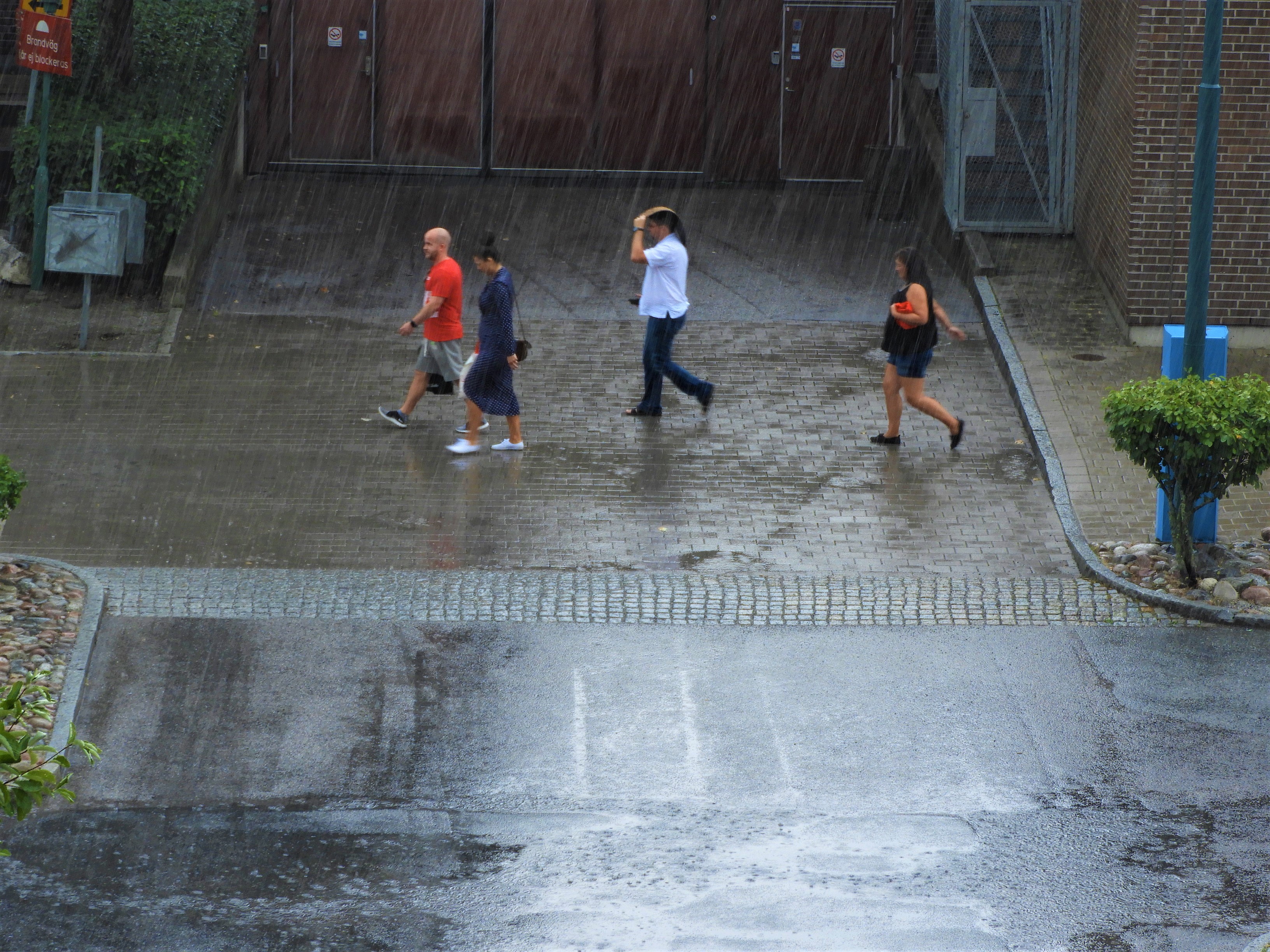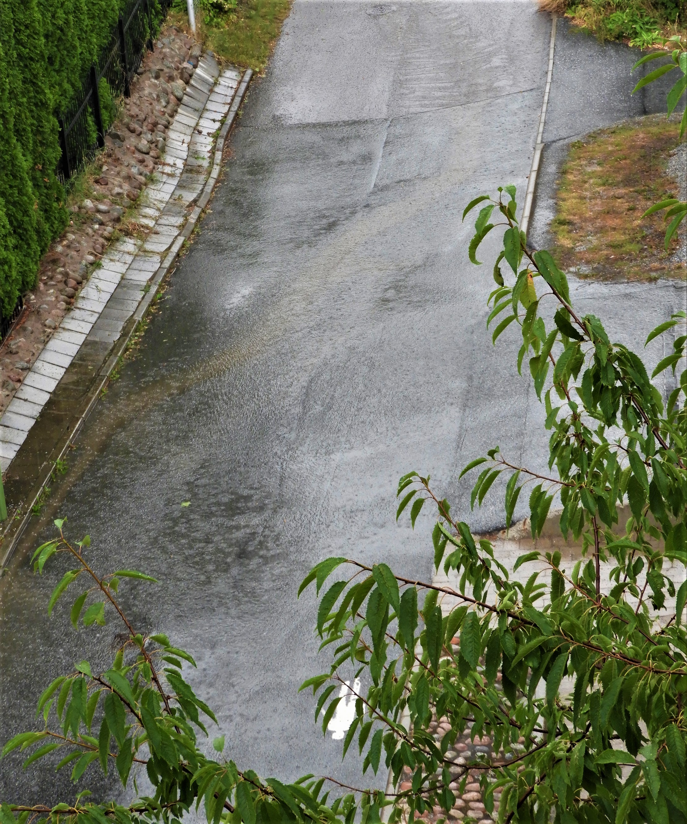 Regnet kom och ganska häftigt. Jag satt i mitt svalkande tvärdrag i köket och hade bundit fast fönstret på glänt och när det det tog i och regnade på tvären kom jag på att fönstret i arbetsrummet var lite öppet. Skyndade dit och där flög papprena som fladdermöss i rummet och de som inte flög badade i en flod som vällde in genom fönsterspringan och redan mötte mej på golvet. Sen hörde jag ett brak och trodde det var åskan men när jag kom ut i köket var fönstret vidöppet, snöret var avslitet, allt på fönsterbrädan var nersopat och papprena på kylskåpsdörren var borta och kunde senare plockas på balkongen. Jag fick igen fönstret med viss möda och golvet var en sjö. Torkade så mycket jag kunde och såg på telefonen att jag missat ett samtal. Det var från Barbro under mig och jag ringde upp men ingen svarade. Tänk om hon ringde och behövde hjälp, jag försökte igen men sen gick jag ner och ringde på hennes dörr och ingen öppnade. Vad gör jag om något hänt henne?