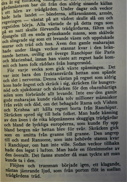 När jag var mycket ung läste jag en bok av Louis Bromfield som hette, När regnet kom. Den gjorde ett starkt intryck på mig och jag känner fortfarande den kletiga fukten på skinnet efter den. Minns inte längre exakt handlingen, mitt ex är tryckt 1944 och jag minns egentligen bara hur den fångade mig. Jag har dessutom bundit in den och vägrat låta den gå på tippen, jag slår upp sidan 13 och minns faktiskt men nu är det nog dags att läsa om den.