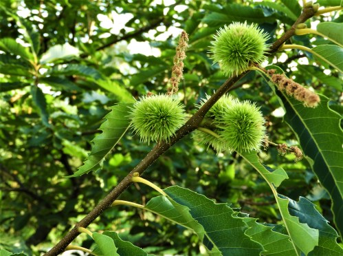 Äkta kastanjen snett utanför entrén till Anderssons växthus är full av nya frukter.