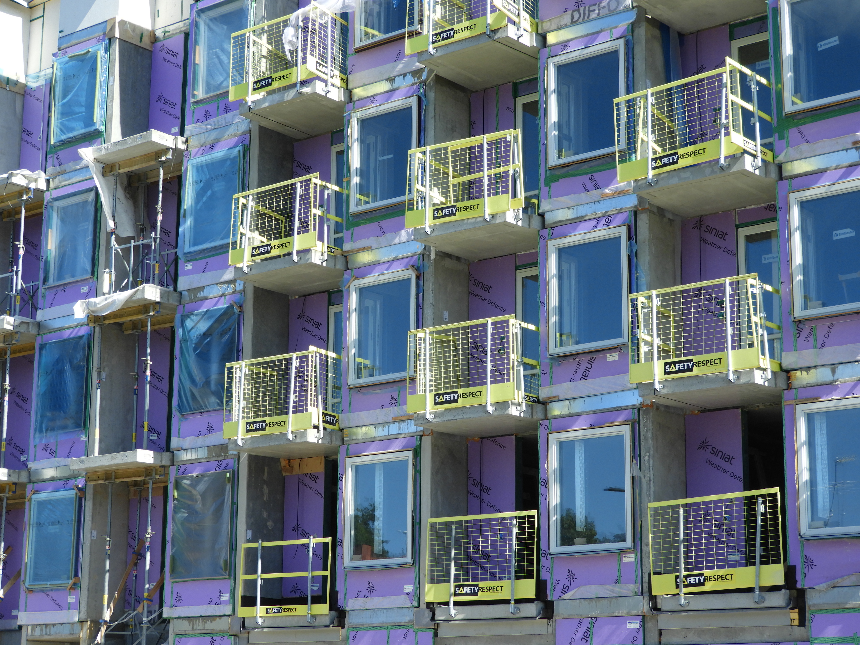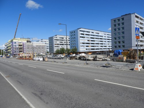 Dragonvägen från söder med ett påbörjat förtätningsobjekt på före detta parkeringsområde.