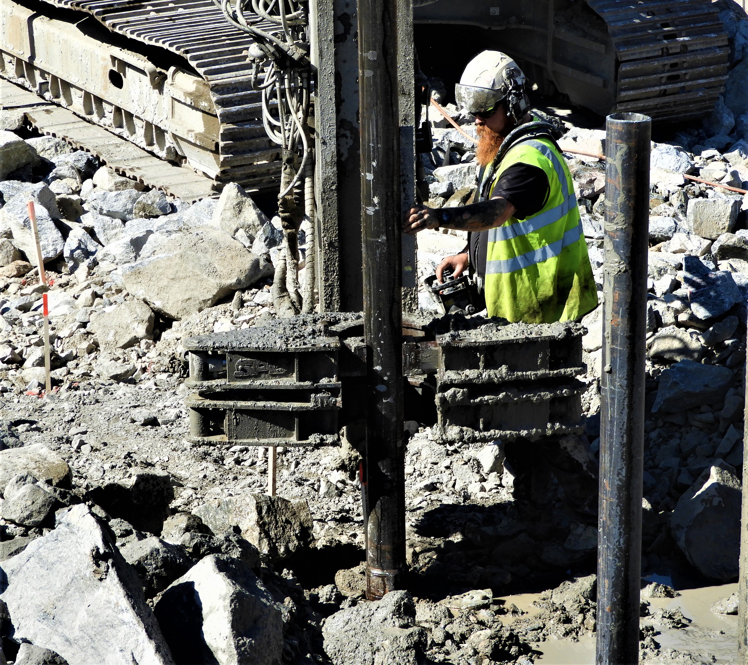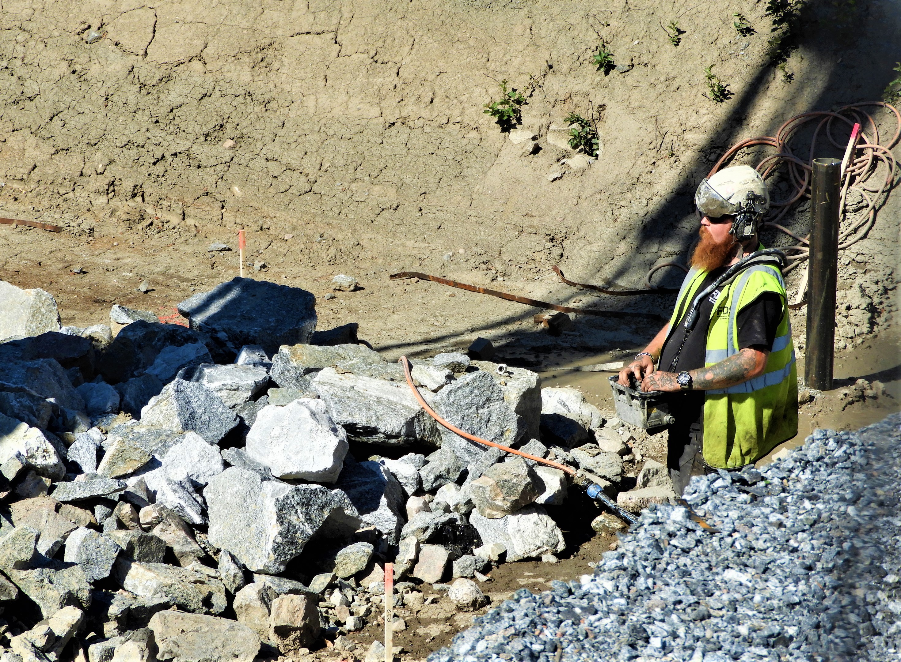 Killen i gul väst styr något borrartatoch vattnet skvätter