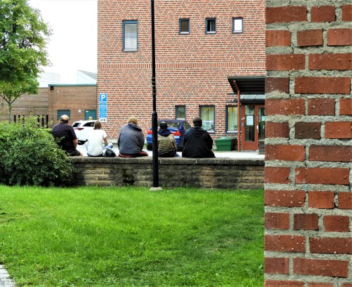 Rundar kvarteret och går mot östra centrumingången,  här sitter gänget som jagas runt av väktare och och som ständigt får hitta nya platser att träffas på, nu vid parkeringen till kyrkan.