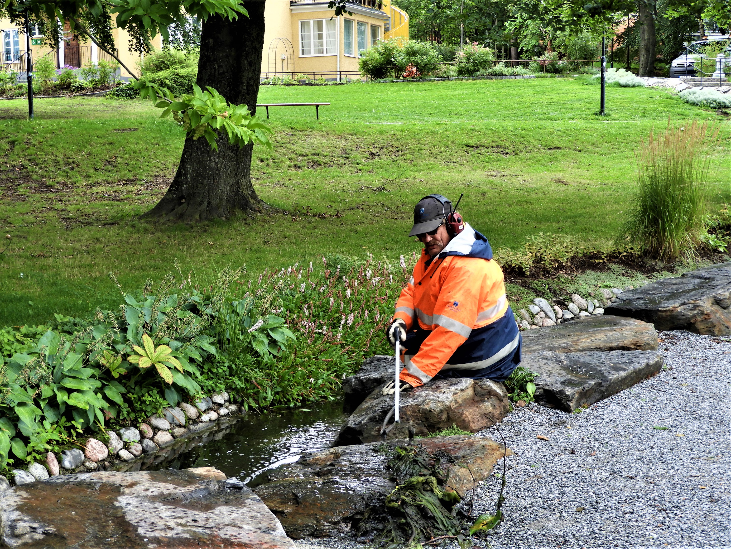 Här fiskas gröna alger upp ur ”livets flod” som sakta förflyttar sig mot dammen