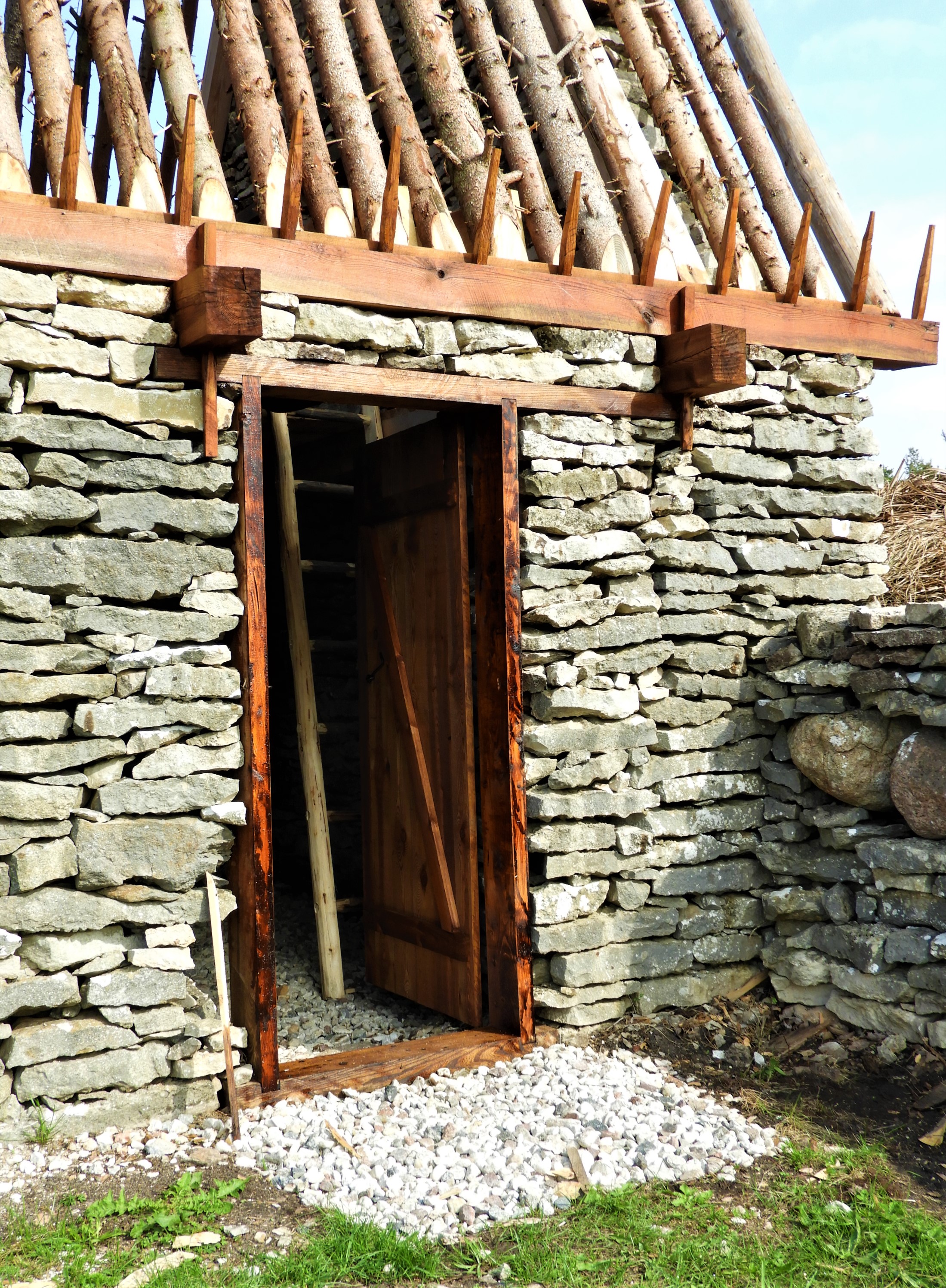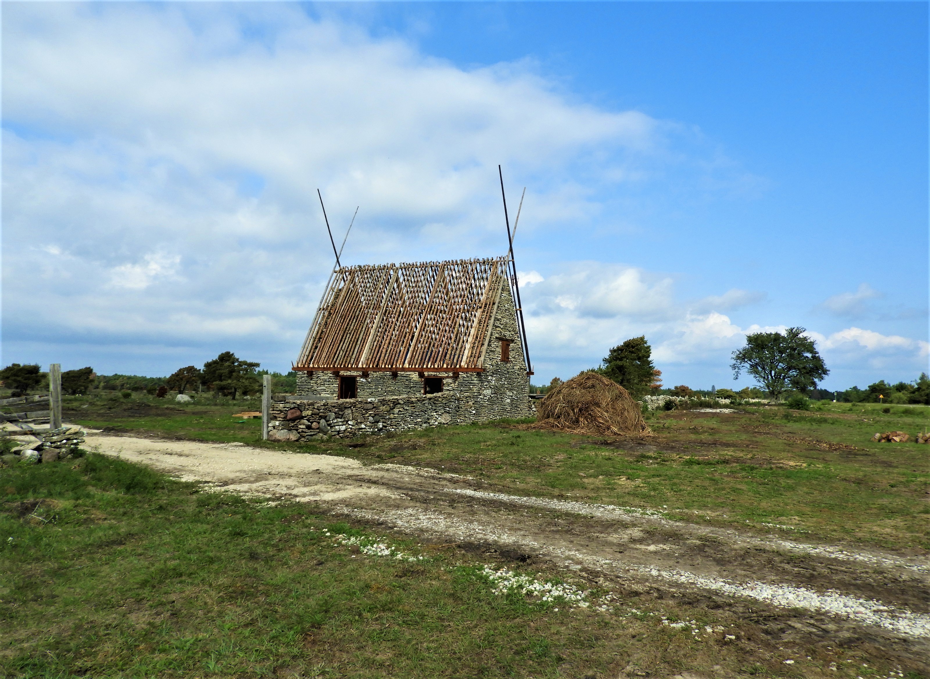 Strax norr om de tre kvarnarna vid Hundlausar utmed stora vägen söderut har en liten ruin börjat få form och nu kan man se vad den ska bli – en lammgift (lambgift). Själva takstommen  som ännu väntar på sitt täcke av ag är mycket vacker. Jag är tvungen att bromsa, stanna och gå runt och beundra huset på nära håll .