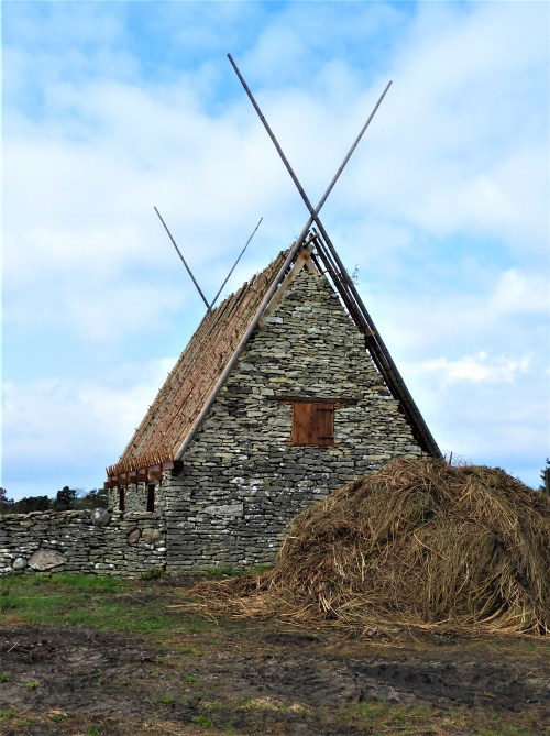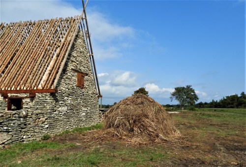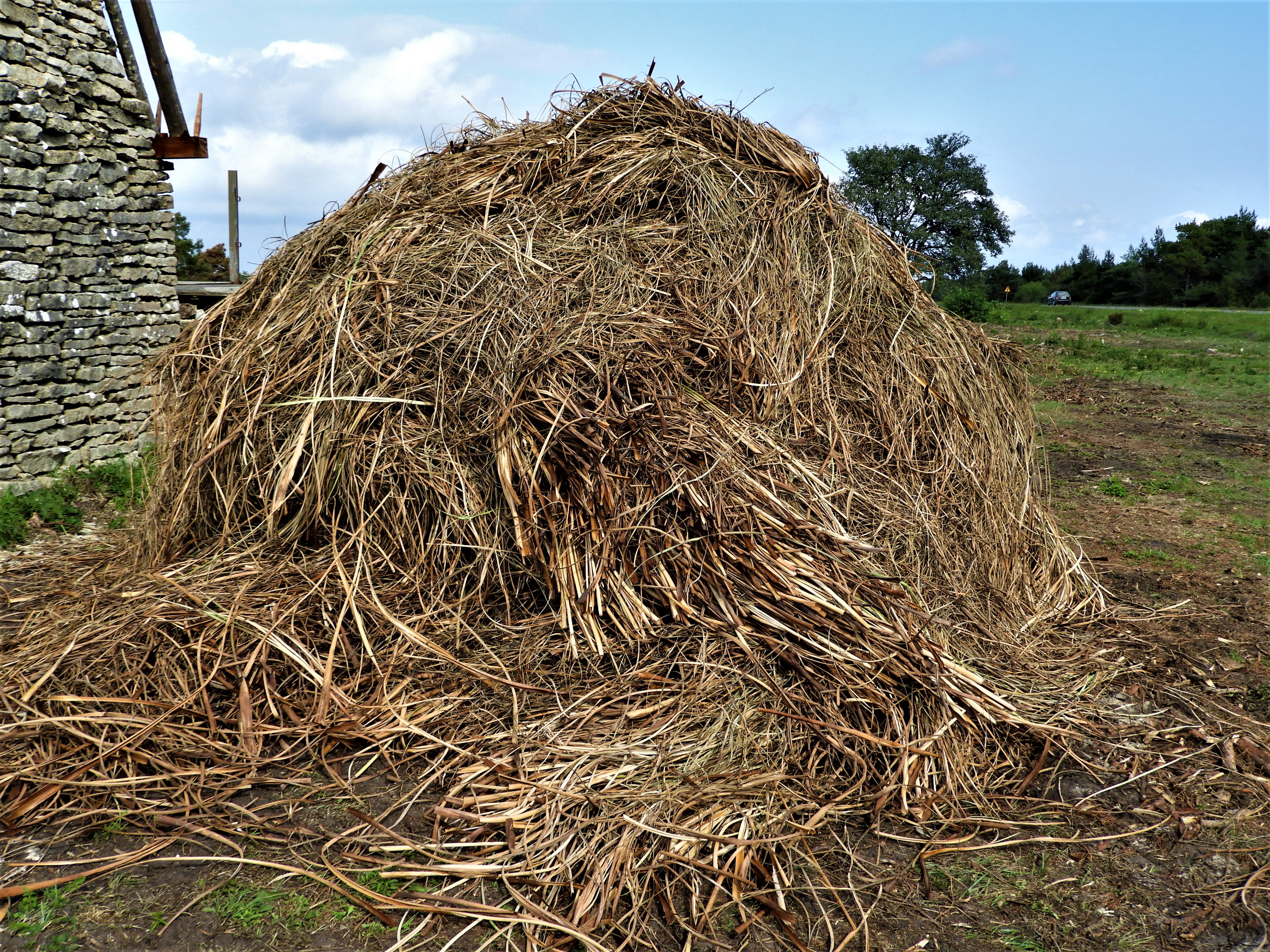 En liten bit från huset ligger en hög med strån, det ser ut som en skräphög men är ag som skördats på en agmyr på en eller flera kilometers avstånd.  Den ska upp på takets täta granstörar som har grenpiggarna kvar för att bromsa de vassa agstråna från att hasa ner och sen ska agen ge huset skydd i åtminstone 30 år.