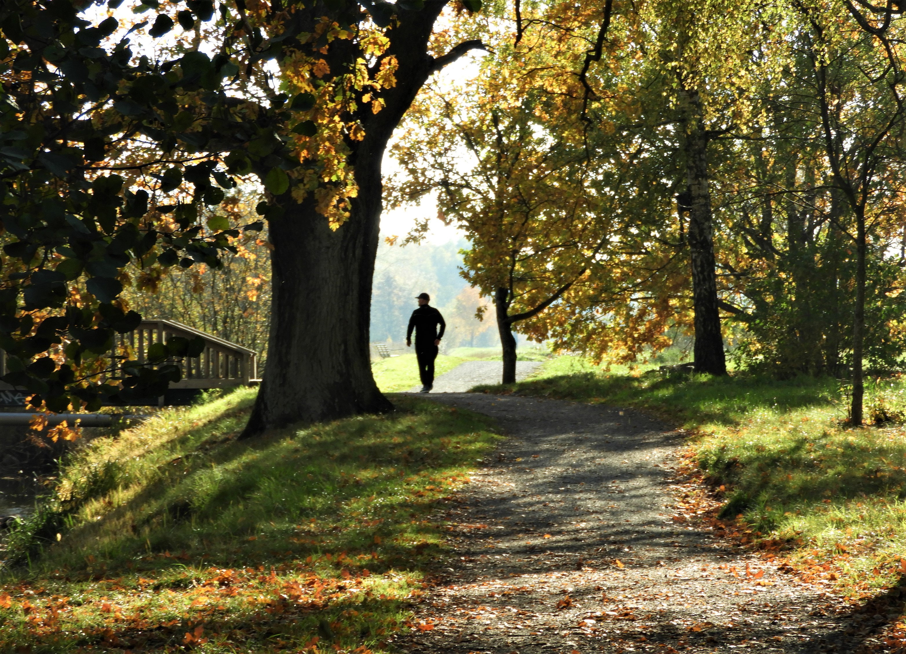 Söndag med strålande sol, jag möter människor på gångvägen som hittat tillbaks till sommarkläderna, bara armar och bara ryggar och jag går den vanliga vägen utmed ån. Solen står lågt och det har hunnit bli eftermiddag, solen går rätt in i ögonen så jag ser inte dem jag möter. Men alla hejar, det har man inte alltid gjort i Väsby och jag blir inte klok på om det beror på att jag ser gammal ut eller om man blivit mindre rädd för att säga hej till främlingar, trevligt är det i alla fall.